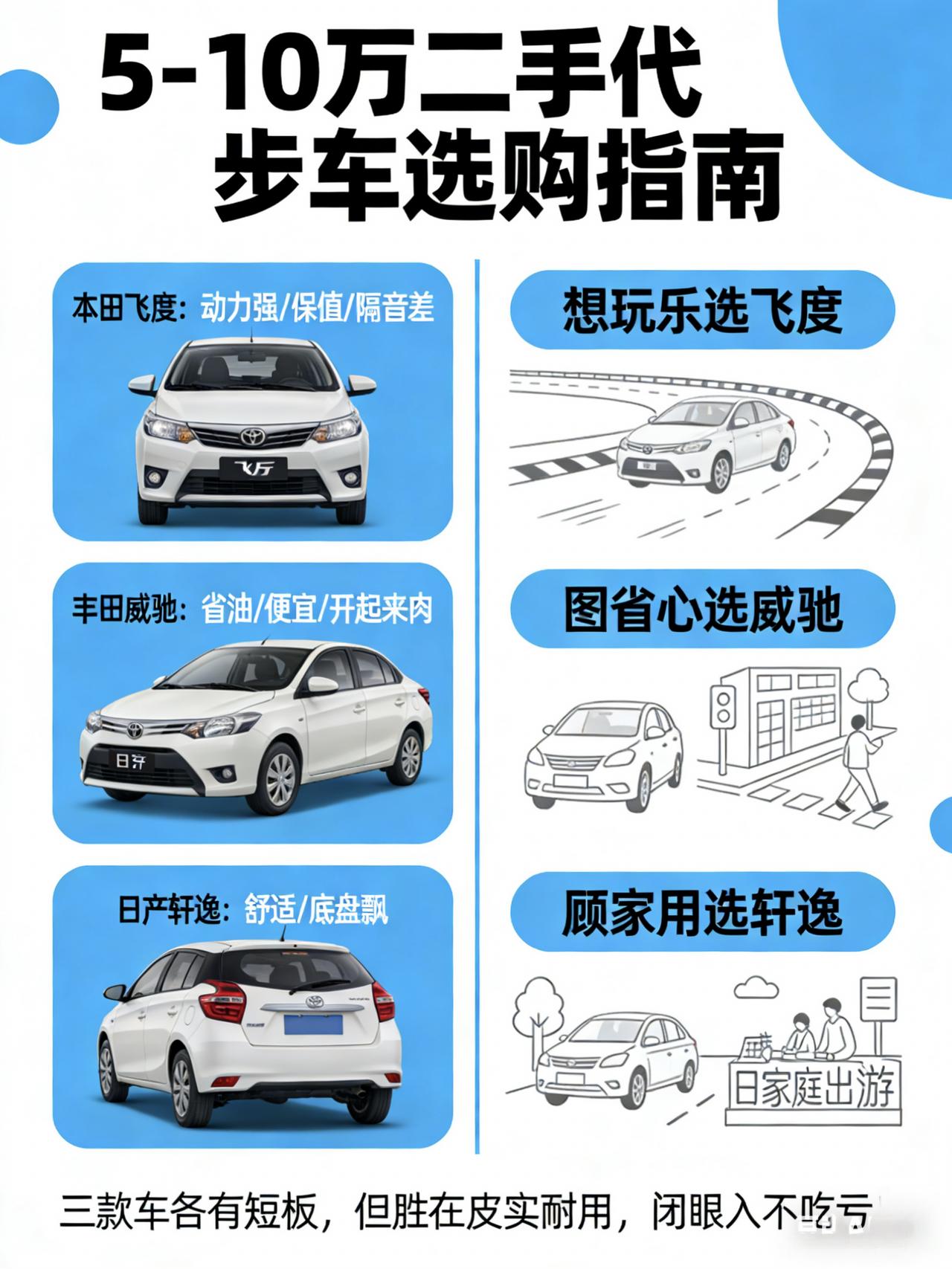 听劝!5-10万预算买二手,这三款才是懂车人眼里的“香饽饽”! “5-10万落地,二手车有啥推荐”的。这预算说多不多,说少不少,正好卡在合资入门级二手车的“甜蜜点”上。要是搁以前,我可能还得犹豫一下推荐啥,但现在?我眼皮都不眨,直接给你圈出三个“钉子户”级别的选手:本田飞度、丰田威驰、日产轩逸。 别看这三位在街上混得“人畜无害”,个个都是经过市场几十年毒打留下的精华。咱们不聊虚的,就聊聊这三款车到底藏着啥样的“心思”,适合啥样的人。 👉本田飞度:那个把“驾驶乐趣”刻进DNA的顽童 如果你还年轻,或者心里还住着个少年,飞度绝对是这三款里最不“买菜”的一个。别看它个头小,那颗1.5L地球梦发动机可是个“暴躁小子”,配合轻盈的车身,红绿灯起步那一下的轻盈感,是同价位其他车给不了的。 这车在二手市场简直就是“理财产品”,保值率高到离谱,开两年想换车,亏不了几个钱,甚至有时候还能小赚一笔。而且它的空间魔术座椅太实用了,后排不仅能坐人,把座椅翻起来就是个巨大的储物格,搬家、露营、拉快递,它都能搞定。 但你要是真想买二手飞度,有三个“坑”我得提前给你填上。 第一是隔音,这车的隔音在高速上简直像开敞篷,风噪和胎噪大到你得靠吼才能跟副驾交流。 第二是内饰,为了控制成本,车里大面积都是硬邦邦的塑料,坐进去那股廉价感扑面而来,甚至过个减速带,内饰件还容易发出“吱吱”的异响。 第三是配置,二手市场上那些年份近的飞度,为了拉低售价门槛,配置砍得那叫一个狠,没有倒车影像、没有中控大屏,甚至连个像样的收音机都没有,买回家第一件事往往就是得自己加装。 说实话买飞度的人,大多是对车有点爱好的。这车唯一的缺点可能就是隔音太“素”,高速上风噪胎噪跟开演唱会似的,内饰也是硬邦邦的塑料感。但你要是一脚油门下去,那种人车合一的灵动,会让你觉得这些缺点都是浮云。 👉丰田威驰:那个把“省心”当成人生信条的老实人 如果你你是个实用主义者,买车就是为了上下班通勤、接送孩子,不想在修车厂浪费哪怕一分钟,那威驰就是你的“本命车”。这车在车圈的地位,就像是那句老话——“开不坏的丰田”。 它的核心竞争力就是“简单粗暴”的可靠性。发动机变速箱技术成熟得掉渣,反而造就了极低的故障率。油耗低到你不敢信,保养更是便宜,路边摊都能修,配件满地都是。对于新手或者家庭主妇来说,这种“你只管开,剩下的交给它”的安全感,太重要了。 不过,选威驰就意味着你得跟“平庸”做伴。首先是动力,那1.5L的发动机带动这台小车都显得有点吃力,要是车上坐满人再开个空调,起步那叫一个肉,超车得提前半条街就开始准备。其次是悬挂,为了省钱,后悬挂基本就是个板车悬挂,过个坑洼路面,车里的人得跟着蹦迪,舒适性几乎为零。最后是安全,很多低配的二手威驰,气囊少得可怜,连最基本的侧气囊都没有,开这车你得全靠自己眼观六路。 我说实话:威驰就像是一杯白开水,虽然寡淡无味,但却是生命之源。它的动力比较“佛系”,超车得提前规划,内饰更是简陋得感人。但如果你追求的是“零烦恼”用车,威驰这种极致的工具属性,反而是一种大智慧。 👉日产轩逸(经典):那个把“大沙发”焊在身上的老油条 如果你买车是为了顾家,或者你是个对舒适性有执念的人,那经典轩逸绝对是绕不开的“舒适区”。在这个价位的二手车上,它的舒适性是降维打击般的存在。 最大的杀手锏就是座椅,日产的“大沙发”名不虚传,软绵绵的包裹感,坐上去就像陷进云朵里,跑长途屁股都不带累的。空间也比前两位宽敞,后排跷二郎腿都没问题。那套1.6L+CVT的动力总成,虽然没啥激情,但胜在平顺得像丝绸一样,开起来稳稳当当,完全符合它“移动大沙发”的定位。 但轩逸的短板也是真让人头疼。 第一是CVT变速箱,这玩意儿虽然平顺,但特别“矫情”,特别是一些年份较老的车,冬天冷车启动时那“哒哒”的异响声,听着就让人心慌,而且急加速时钢带容易打滑,寿命到了还得大修,维修费能赶上半辆车的钱。 第二是隔音,轩逸的隔音在同级里也是出了名的差,跑上80码,发动机的声音、风噪就跟赶集一样热闹,想在车里安静听首歌?那是奢望。 第三是操控,底盘松散,过弯侧倾严重,开快了心里没底,完全就是个跑不快的“老爷车”。 不得不说买轩逸,买的就是个“舒服”。不过它的外观确实有点老气横秋,不太适合追求个性的年轻人。而且因为保有量太大,路上见得太多了,没啥新鲜感。但作为一台纯粹的家用车,它把“让人坐得舒服”这件事做到了极致。 总结一下: * 想开得爽、玩得嗨,选飞度; * 想当个甩手掌柜、不操心,选威驰; * 想让全家人坐得爽,选轩逸。 兄弟们,买车就是选生活态度,选对了车,每天的通勤都是享受!【来自懂车帝车友圈】
