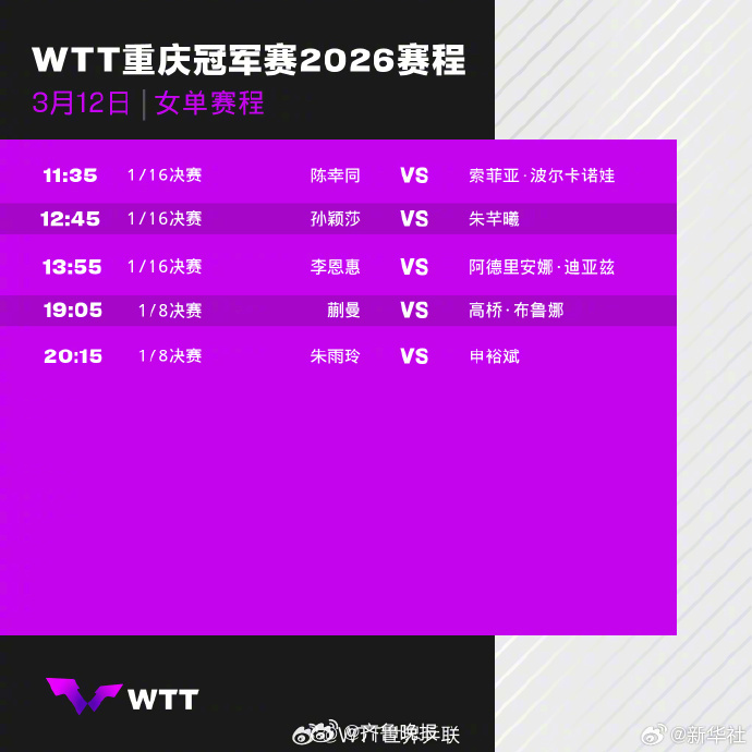 【#WTT重庆冠军赛#今日赛程】2026WTT重庆冠军赛3月12日赛程已出炉,等