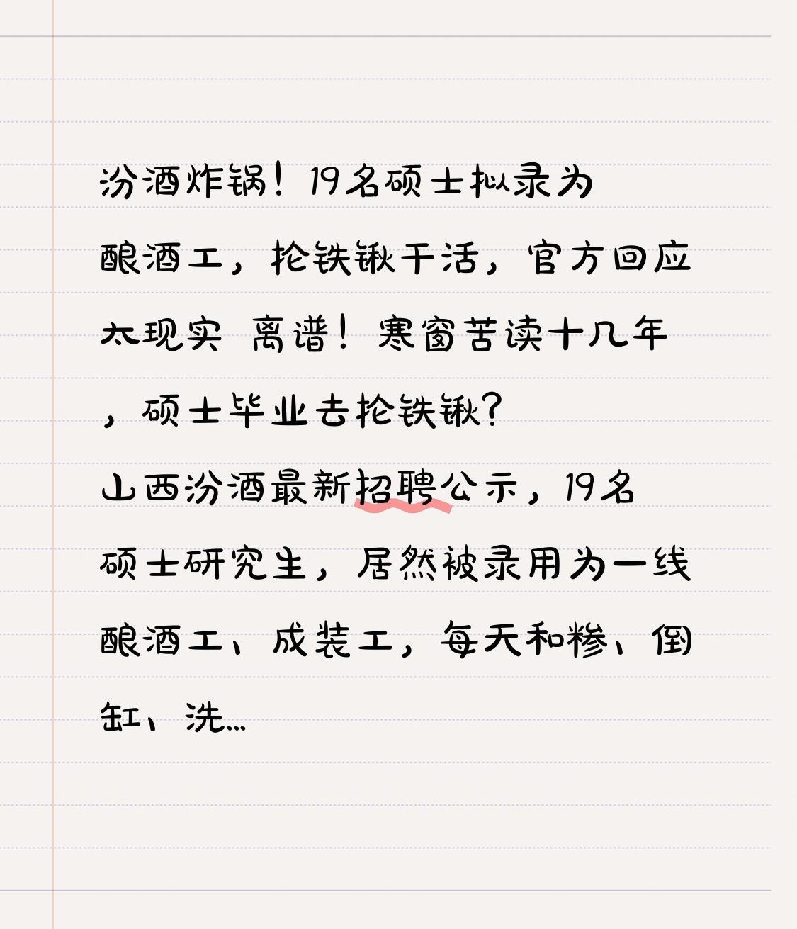 汾酒炸锅!19名硕士拟录为酿酒工,抡铁锹干活,官方回应太现实 离谱!寒窗苦读十几年,硕士毕业去抡铁锹? 山西汾酒最新招聘公示,19名硕士研究生,居然被录用为一线酿酒工、成装工,每天和糁、倒缸、洗瓶子,干的全是体力活!消息一出全网吵翻:读书还有用吗?这是不是大材小用?就在争议声中,汾酒官方正式回应,真相彻底颠覆认知! 很多人骂浪费人才,说硕士干体力活纯属多余,可汾酒的回应,直接打醒所有人! 第一,真不是坐办公室,全是一线重体力。酿酒工要扛粮食、翻酒醅,成装工要流水线操作,劳动强度极大,不是谁都能干。 第二,不唯学历,公平竞争。中专、大专、硕士一起考,只要有技能证、符合年限就能报,硕士能考上,凭的是真本事。 第三,学历有优势,工资更高、晋升更快。汾酒明确说,硕士起点工资就不一样,一线历练后,转技术、走管理,上升空间远超普通人。 更扎心的是,现在的酿酒早已不是纯体力,而是懂工艺、懂微生物、懂标准化的技术活。高学历下沉一线,不是屈才,是企业在储备人才,是年轻人看清了:稳定、有前景、有晋升,比虚名更重要。 那些嘲笑读书无用的人,根本不懂:硕士抡的不是铁锹,是未来的敲门砖。 这件事,戳破了当代就业最大的谎言:高学历必须坐办公室。 时代变了,蓝领不再是低端代名词,大国工匠、技术骨干,全从一线来。硕士愿意沉下去,不是读书没用,是他们更清醒——没有从天而降的管理岗,只有脚踏实地的成长路。 与其挤破头内卷虚无的白领岗,不如在实业里扎根,有技能、有晋升、有保障,反而更踏实。 真正的体面,从来不是坐在空调房里,而是靠自己的本事吃饭,有奔头、有未来。为这些沉下心的硕士点赞,也为务实的汾酒点赞! 你支持硕士去一线当酿酒工吗?评论区说说你的看法!