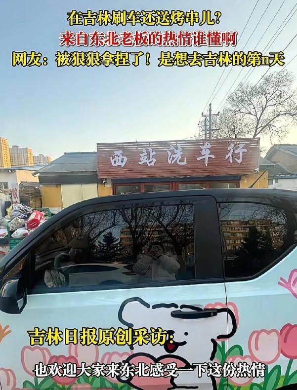 暖心!吉林,女子下班去刷车,赶上老板家聚餐,女子说:我明天再来吧,老板直接让她进屋,塞给她一串羊肉串,让她吃着等,还给她扒了一瓣蒜,女子也没客气,吃着烤串等着,等她吃完再一看车,更加开心了,网友:这大馋丫头!   事情发生在3月9日傍晚,吉林市一位李女士忙完一天的工作,趁着下班顺路,开车去常去的刷车店打理爱车,连着几天的奔波,车身沾了不少灰尘,她想着赶紧刷干净,第二天还要送朋友出门。   没想到一到店门口,就被里面的热闹劲儿拦住了脚步,刷车店的屋里灯火通明,欢声笑语飘得老远,李女士探头一看,原来是老板一家正在聚餐,桌上摆着刚烤好的羊肉串,香气直往鼻子里钻。   她心里立刻犯了嘀咕,人家一家人团聚吃饭,自己这时候来刷车,难免会打扰,与其添乱,不如改天再来,她悄悄往后退了两步,正准备转身开车离开,没想到被眼尖的老板给看见了。   老板连忙放下手里的碗筷,快步走了出来,一边招呼她一边摆手,丝毫没有嫌弃被打扰的意思,没等李女士开口说明来意,老板就不由分说地拉着她往屋里走,还笑着说车不算大,很快就能刷好,让她进屋等着,别站在外面受凉。   进屋后,看着满桌的饭菜和热闹的氛围,李女士多少有些拘谨,坐在一旁安安静静地等着,眼神却忍不住往烤串上瞟,忙活了一天,她早就饿了,那股子肉香实在太诱人。   老板看出了她的局促,顺手从烤架上拿起一串刚烤好的羊肉串,递到她手里,还细心地扒了一瓣蒜递过去,叮嘱她吃着垫垫肚子,解解腻。   李女士也没过分客气,知道东北人的热情,推托反而显得生分,她接过烤串,咬上一口,外焦里嫩的肉香在嘴里散开,配上解腻的大蒜,一天的疲惫仿佛都被这口烟火气驱散了。   她安安静静地吃着串,偶尔和老板家人聊两句家常,原本陌生的距离感,瞬间就被暖意取代,没多大一会儿,老板就喊她去看车,李女士放下手里的蒜,走到屋外一看,瞬间笑开了花,爱车被刷得干干净净,车身亮得能照出人影。   这件事被分享到网上后,很快就引发了网友热议,有人调侃李女士是“大馋丫头”,嘴上想着改天再来,吃起串来一点不含糊,更多人则被老板的热情打动,留言说“这就是东北人的底色,真诚又大方,来了就是客人”。   一句热情的招呼,一串暖心的烤串,一次用心的刷车,藏着最朴素的人情味,也正是这份不掺杂质的热情,让吉林这座城市,多了一份烟火气,也多了一份让人念念不忘的温暖。