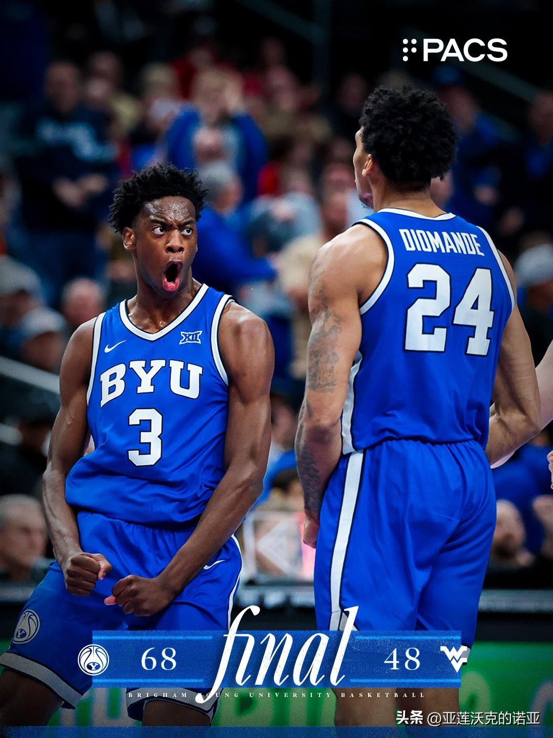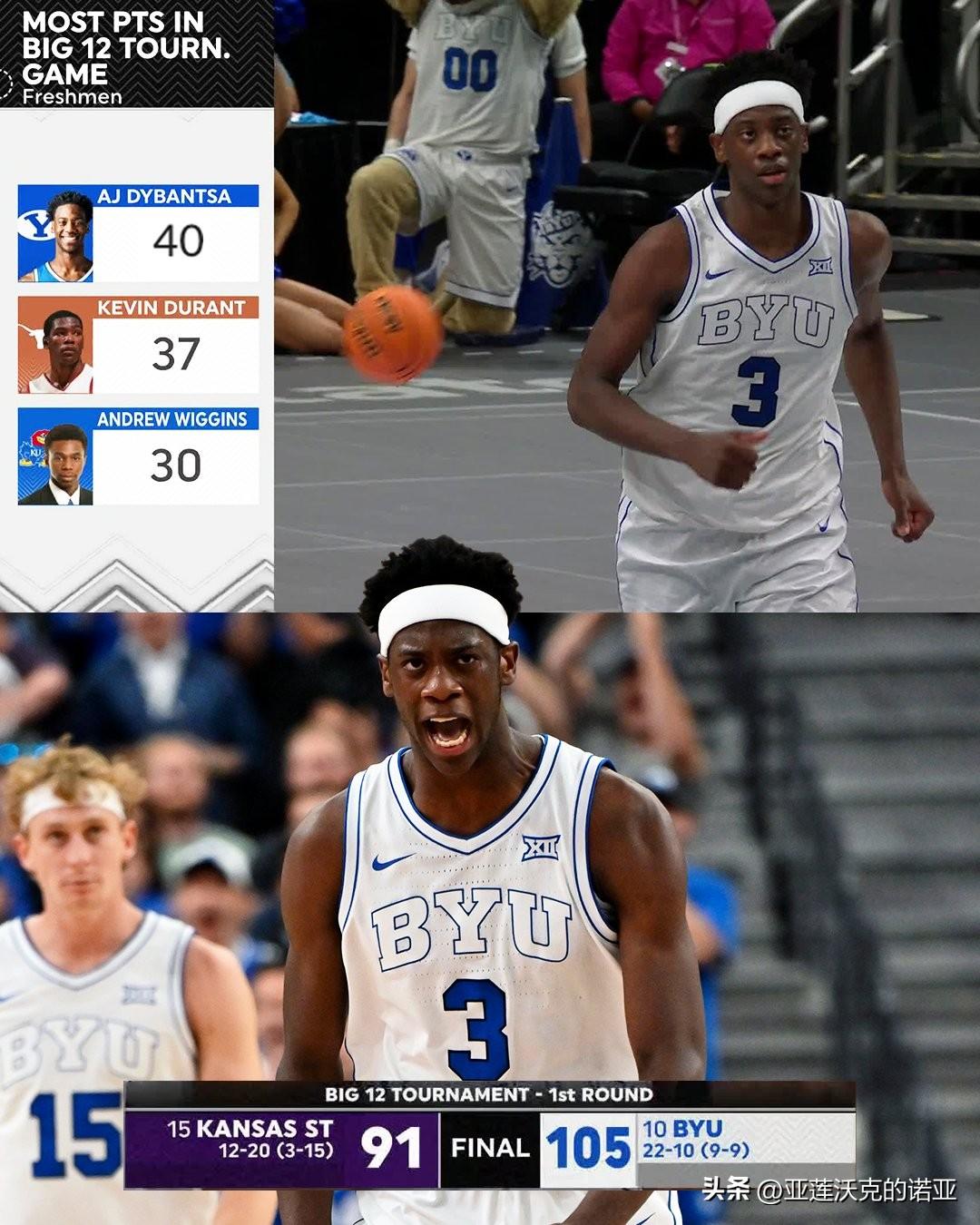 杨百翰AJ Dybantsa本赛季第26场得分20+,Big 12联盟历史上新生第二多的得分20+,仅次于德州大学杜兰特的30场,迪班萨在堪萨斯城举办的Big 12联盟锦标赛前两场比赛场均得到33.5分8篮板,酋长主帅安迪-里德Andy Reid来到现场为母校加油,另外还有四分卫马霍姆斯Patrick Mahomes。