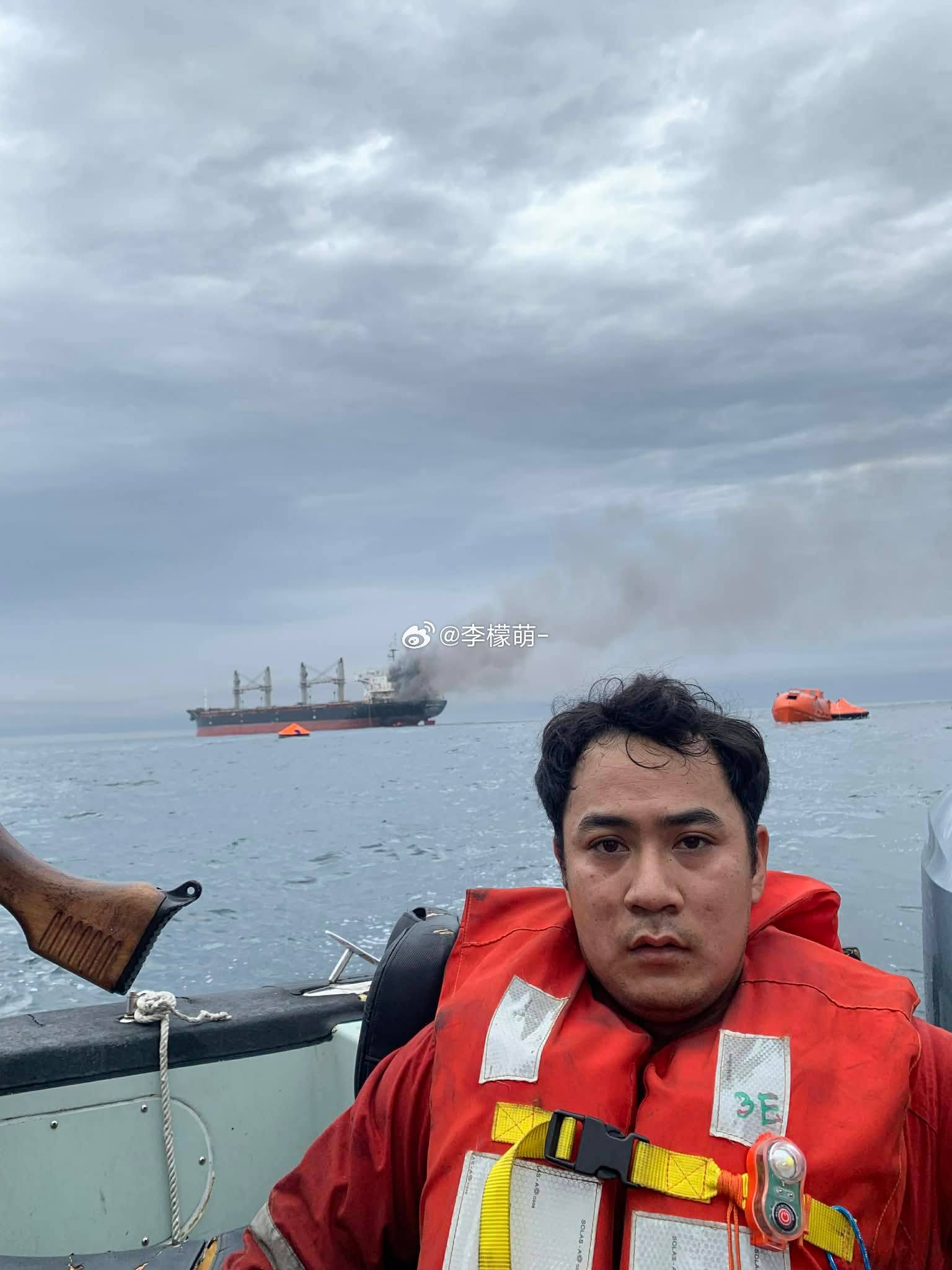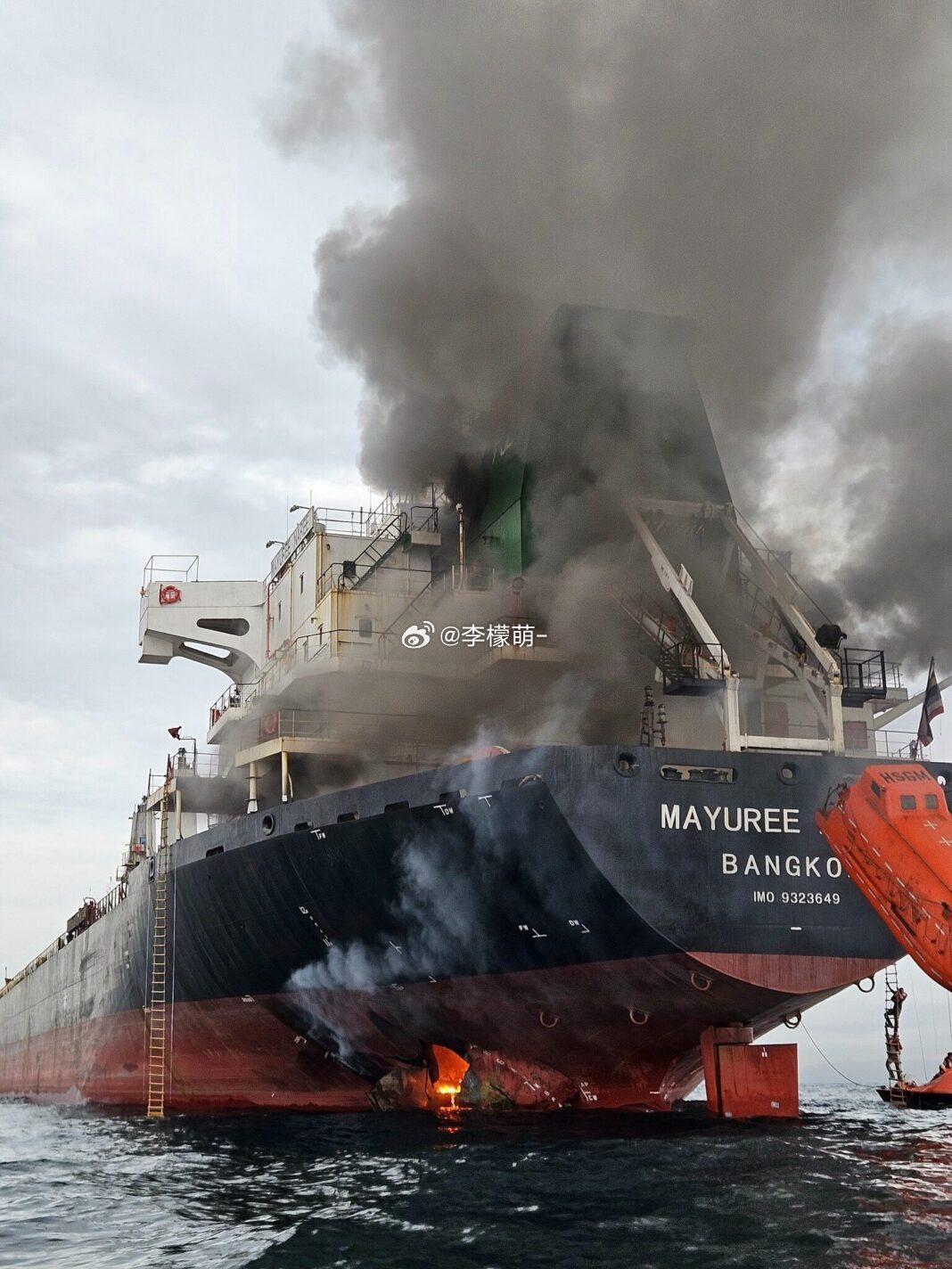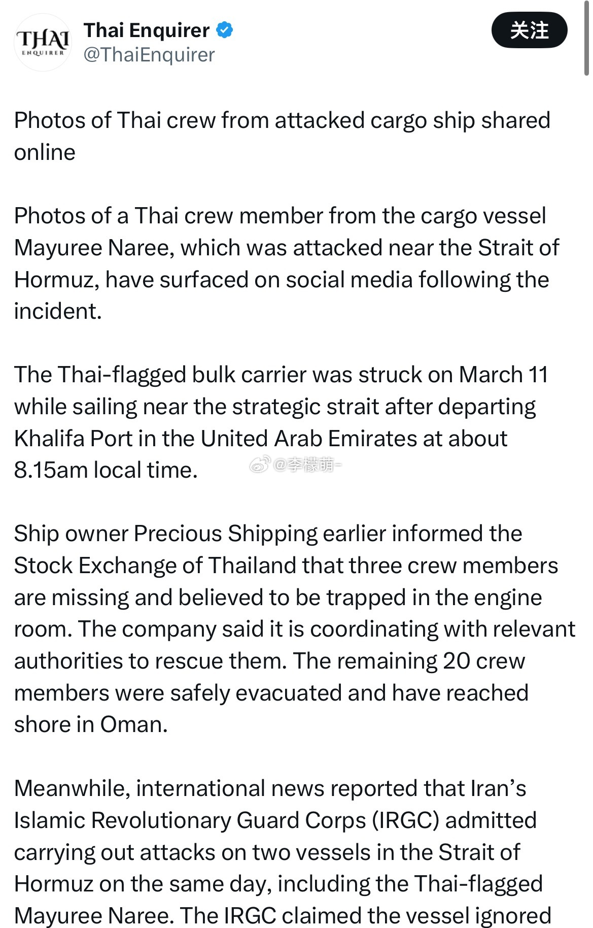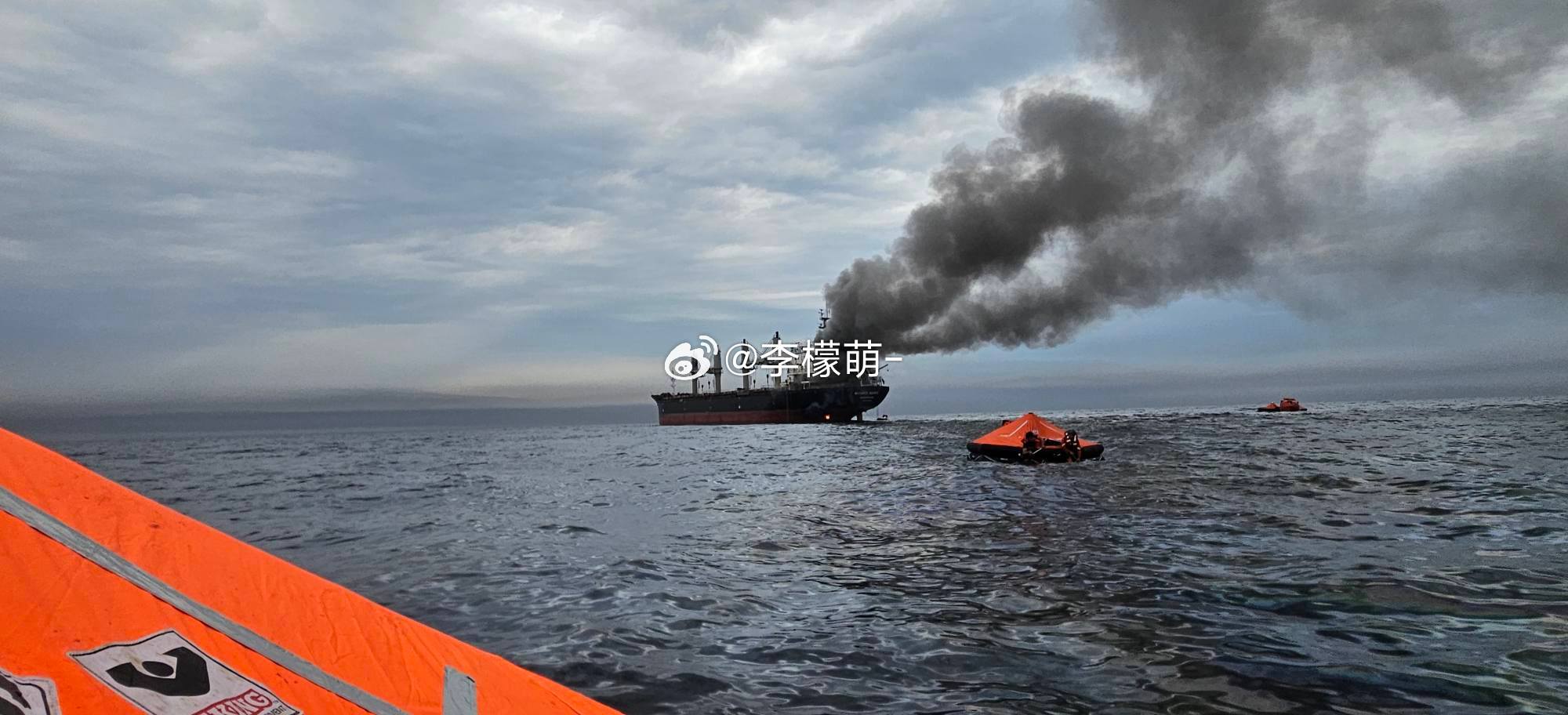 一艘泰国货船,在霍尔木兹海峡炸了。3万吨的散货船,拖着火,漂在水上。20名船