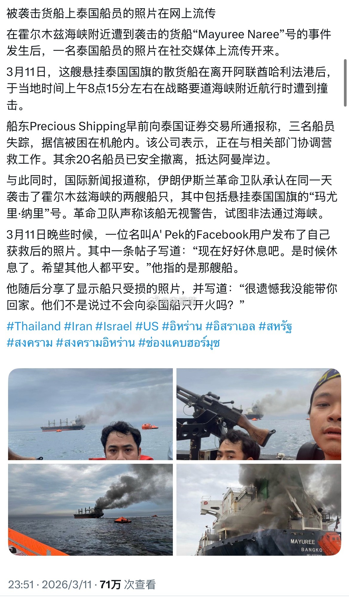 泰国货船在霍尔木兹海峡遭遇伊朗袭击照片曝光:船员一脸沮丧,小国就是一盘菜!3月1