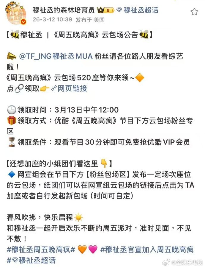 穆祉丞粉丝云包场穆祉丞粉丝云包场周五晚高疯 恩仔成年后的第一个综艺,粉丝云包场来支持啦!!穆祉丞官宣加入周五晚高疯