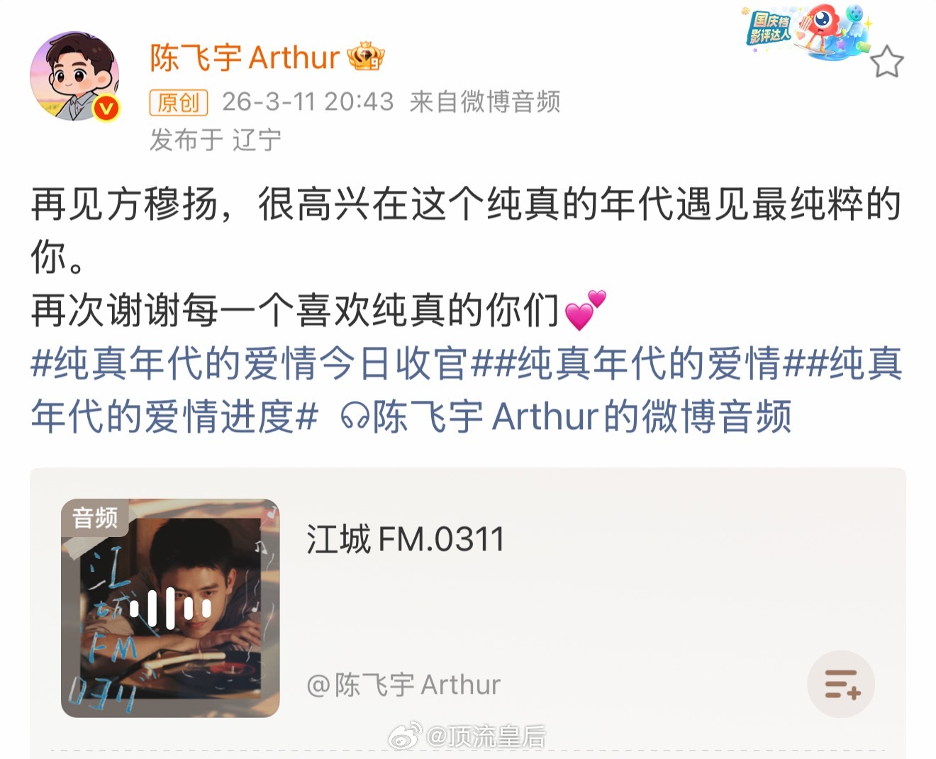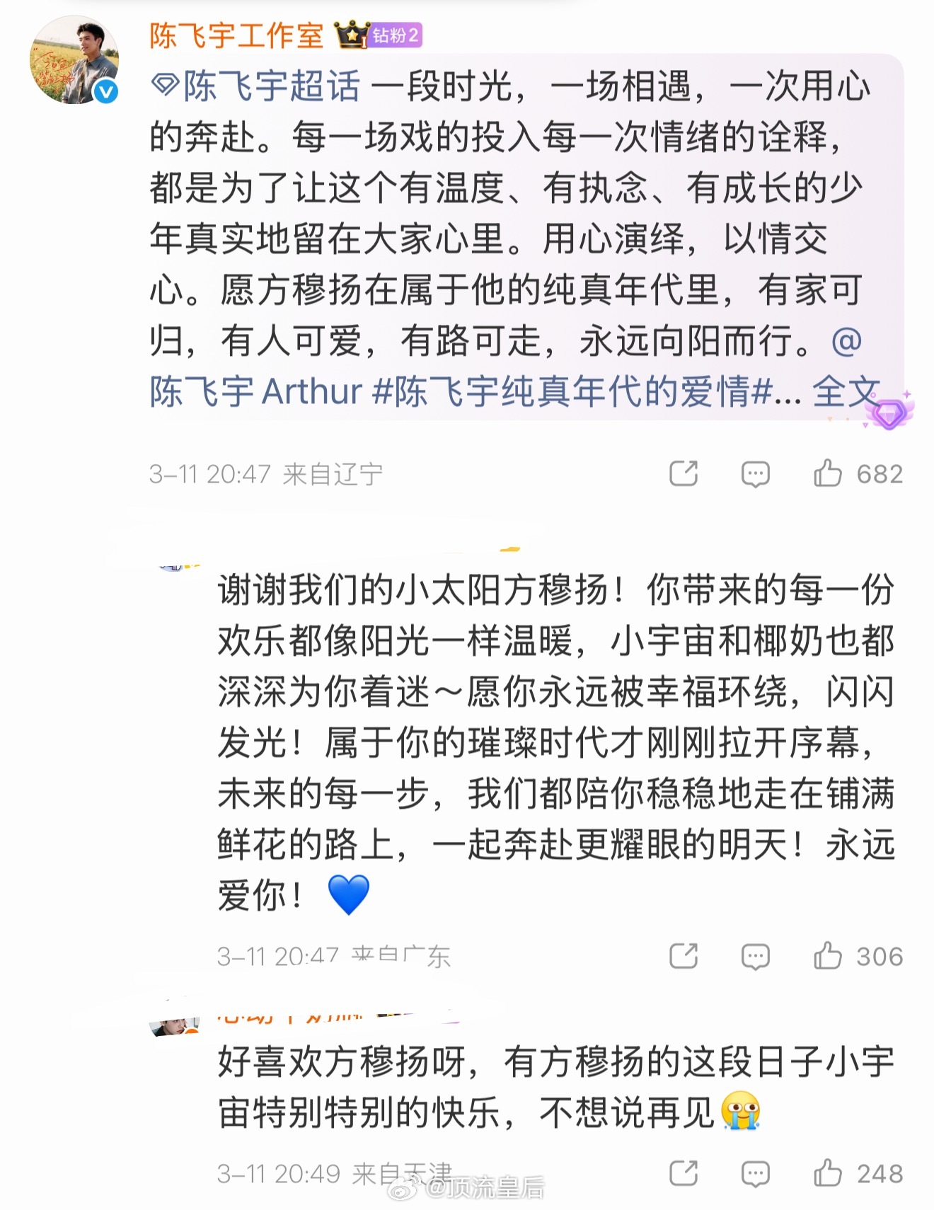 被陈飞宇纯真年代的爱情收官语音博评论区粉丝真情实感的赞美感动到了,感觉就是一个很用心演戏的演员和一群真心喜欢看剧的粉丝在剧集圆满收官时进行的一场盛大情感交流和告别。演员回归作品,粉丝回归观众,热烈且持久的爱意在流淌。