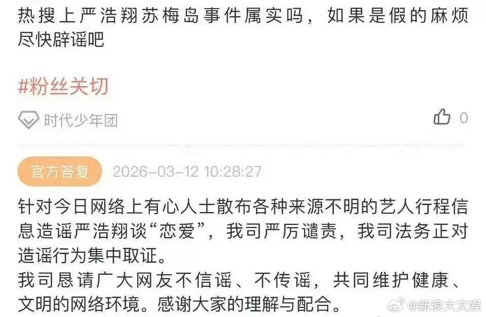 严浩翔方回应严浩翔方否认恋爱 近日,网传严浩翔情人节去了苏梅岛,引热议。对此,时
