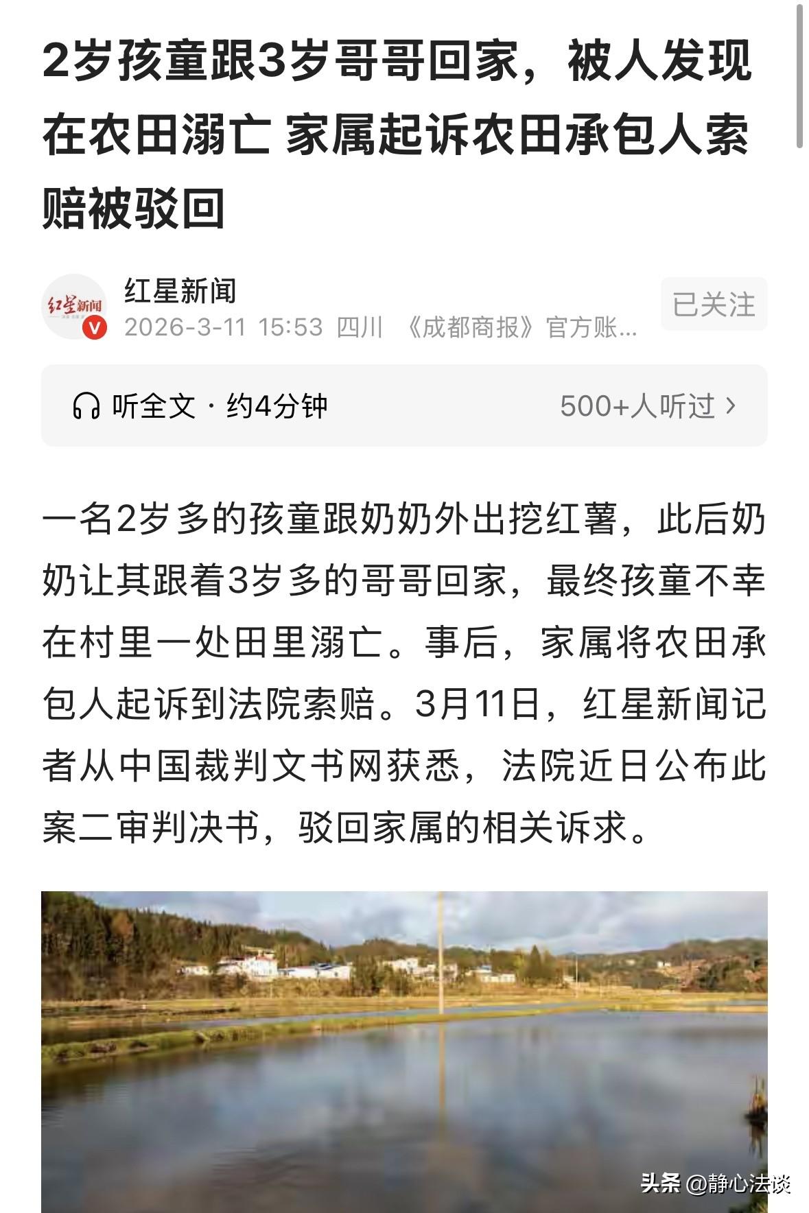 云南,奶奶带两个小孙子上山挖红薯,孩子挖了一会想回家,奶奶就让3岁的哥哥带着2岁的弟弟先回家,自己在挖一会,没想到,2个孩子在回去的途中,掉到一处水田里,等被人发现时,2岁的孩子已经没了呼吸,事后,男孩家人无法接受事实,一纸诉状把承包水田的人给告上法庭,要求赔偿49万元,没想到法院最后这样判了!网友:别拿别人的错,掩盖自己的失责! 2024年11月2日,56岁的奶奶牵着两个小孙子去山上挖红薯。 挖了没一会,两个孩子就想要回家,奶奶看着满地的红薯,想在挖一会。 就让3岁的张某已带着2岁的张某戊结伴先回家。 当时不知道她咋想的,让2个孩子都是连路都走不稳的年纪自己回去,自己则转身继续挖红薯。 做梦都没想到,这一放手,成了一辈子都抹不掉的痛。 下午4点多,村民张某辛路过村边水田,一眼看见水面上飘着2个小小的身影。 他一个箭步冲过去,伸手把孩子捞了起来,任凭他怎么抢救,2岁的张某戊那具小小的身体,早已没了半点气息。 3岁的哥哥张某已经过抢救,还好是捡回来一条命。 奶奶得知消息时,还在挖着红薯,老人听闻腿一软,整个人重重砸在泥地上。 她张着嘴,半天发不出一点声音,直到喉咙里挤出撕心裂肺的哭嚎,那哭声里裹着懊悔。 她瘫在那,一遍遍地拍着大腿哭,眼泪混着泥水流进地里,连自己都觉得荒唐。 好好的带孙子俩出门挖红薯,如今却只剩她一个人失魂落魄地坐在泥里。 她想不明白,这条路自己带两个孙子走了很多次,每次都是两人结伴回家,这次怎么就掉到那片水田边。 孩子的父母接到消息时更是悲痛欲绝,他们无法接受,好好的两个孩子,怎么说没就没了一个。 伤心过后,家属一纸诉状把水田承包人,张某一家告上法庭,索赔49万余元。 理由是张某家在清理杂草时挖深了地,想改成鱼塘养鱼,留了安全隐患,所以两个孩子才会掉进去出事。 原来这块地之前荒了多年,杂草半人高,还堆着垃圾,2024年3月,张某才请人用挖机清理干净。 对此,法院驳回诉求,经查明,张某清理只是恢复耕地,没大幅加深,更没有证据证明他要改鱼塘。 事发时水深一尺多,刚到成年人膝盖下面,对正常耕地来说,这点水再平常不过。 男孩家属对于这个接受,于是提起上诉,退而求其次要求赔偿总损失的10%约9.9万元。 家属一口咬定农田被改成水塘有隐患,可从头到尾,拿不出任何有效证据。 最终,二审法院驳回了家属上诉请求,维持原判。 因为承包农田是用来种地的,不是公共场所,也不是经营场所,张某家没有对不特定公众的安全保障义务。 总不能要求每个农户,都把自家耕地围上围栏、插上警示牌,防止孩子跑进去玩水。 《民法典》第26条:父母对未成年子女负有抚养、教育和保护的义务。 《未成年人保护法》第16条:监护人应当为未成年人提供生活、健康、安全等方面的保障,对未成年人进行安全教育,提高自我保护意识和能力。 2岁张某戊属无民事行为能力人,无任何自保能力。 爷爷奶奶、父母,才是孩子的第一责任人,他们本该寸步不离地守护。 奶奶让其脱离监护、独自回家,属严重监护失职,是事故直接、根本原因,依法自担全部责任。 事故发生后,家属的做法也让人无法理解,没人知道孩子掉到水田里,他们既没及时报警,也没做检查,连准确的原因都没法确认。 就这么急着把责任甩给承包人,仿佛只要有人被起诉,就能弥补失去孩子的痛。 有人替家属喊冤,觉得农户也该有点责任,可是过错,不是同情。 张某清理荒地是正常种地,没改变农田用途,没刻意制造危险。 他没有错,凭什么要为别人的监护失职买单? 这件事也撕开了很多家庭的遮羞布,多少家长,总觉得自家孩子不会那么倒霉。 总想着找个别人的错来分担责任,却忘了,对孩子来说,最可靠的安全,从来都是父母的手,不是别人的田。 不要等到出了事,才知道后悔,更不要等出了事,去别拿别人的错,掩盖自己的失责! 对此,你怎么看这件事! @静心法谈 学法辨是非,慬法不吃亏。