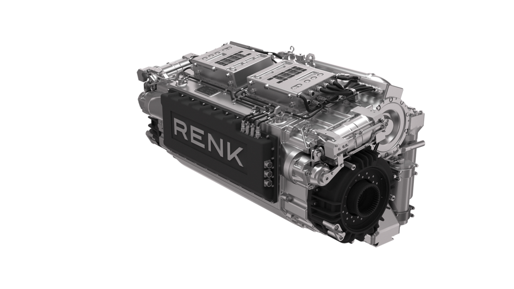 除了发动机外,目前德国RENK公司也正在为50吨至70吨级下一代坦克提议一种新型机电复合传动系统,称作HSWL 406,该传动系统基于ATREX并联式混动电传动概念,ATREX早在2024年就作为技术验证装置开发完成。ATREX代表“线控先进RENK电动十字型传动系统”,输出功率可达1400-1500千瓦(1900-2000马力),传动系统集成了一组300千瓦EPD集成式驱动电机,以及一组150千瓦的ESD转向电机,电机组可以转换成发电机模式为车载武器或设备供电,透过传动上的ECU单元控制。(图9)