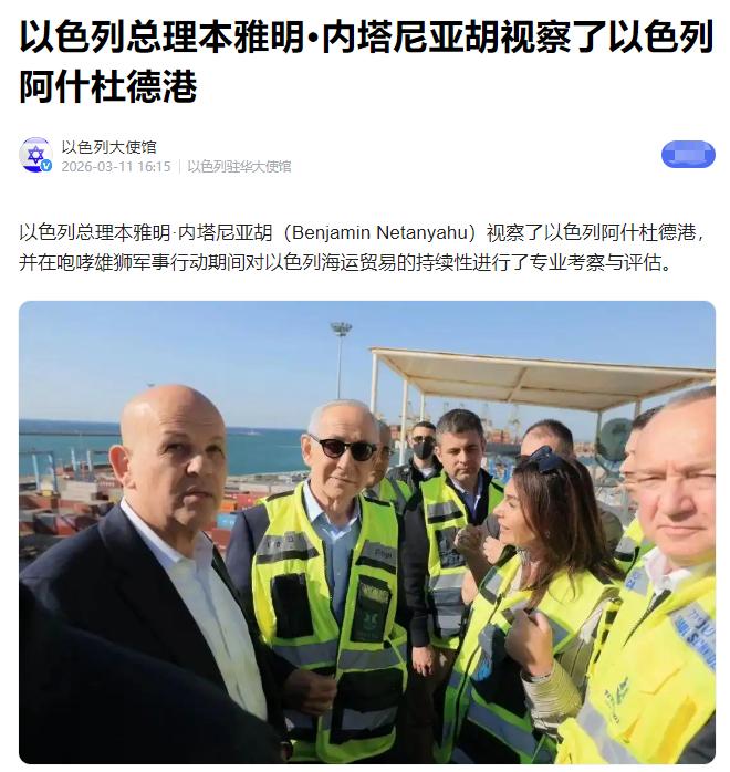 以色列的应对同样体现了信息战的思维。在猜测发酵三天后,3月10日内塔尼亚胡突然出现在阿什杜德港的视察现场,镜头清晰捕捉到他站在港口码头,背景是运转的起重机和货轮,讲话中强调防空系统有效、国家经济未停摆。