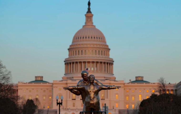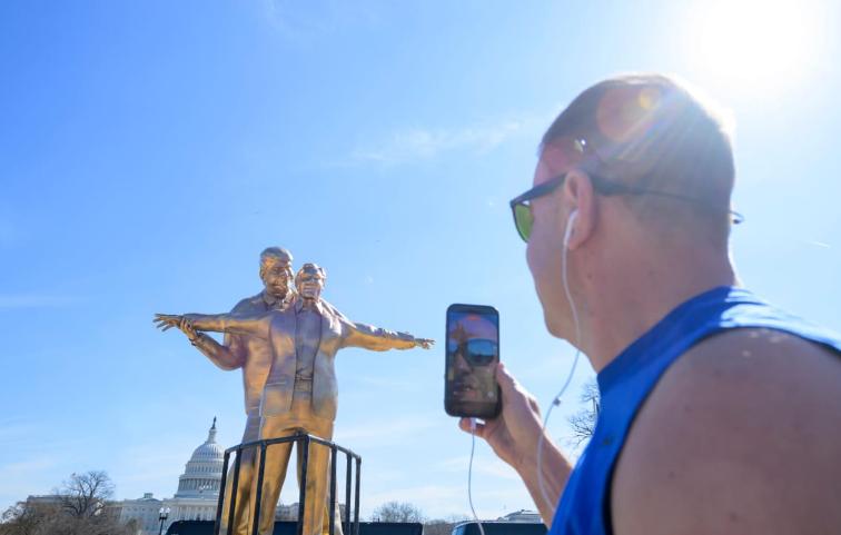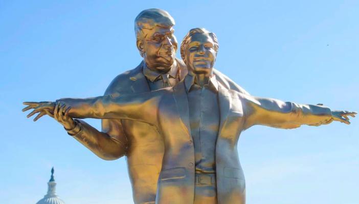 美国华盛顿特区国会大厦附近竖起了一座铜质雕像,内容展示了两个据称关系密切的人。 事实上,雕像中的俩人,分别是唐纳德-特朗普和杰弗里-爱泼斯坦,他们以电影经典场面 "泰坦尼克号 "的姿势相拥,其中, "世界之王 "为特朗普张开双臂,紧紧搂抱着臭名昭著的爱泼斯坦。 1997 年上映的电影,主角杰克和罗丝在泰坦尼克号船头的浪漫拥抱吸引了无数观众,展现了两人之间深厚的信任和感情。