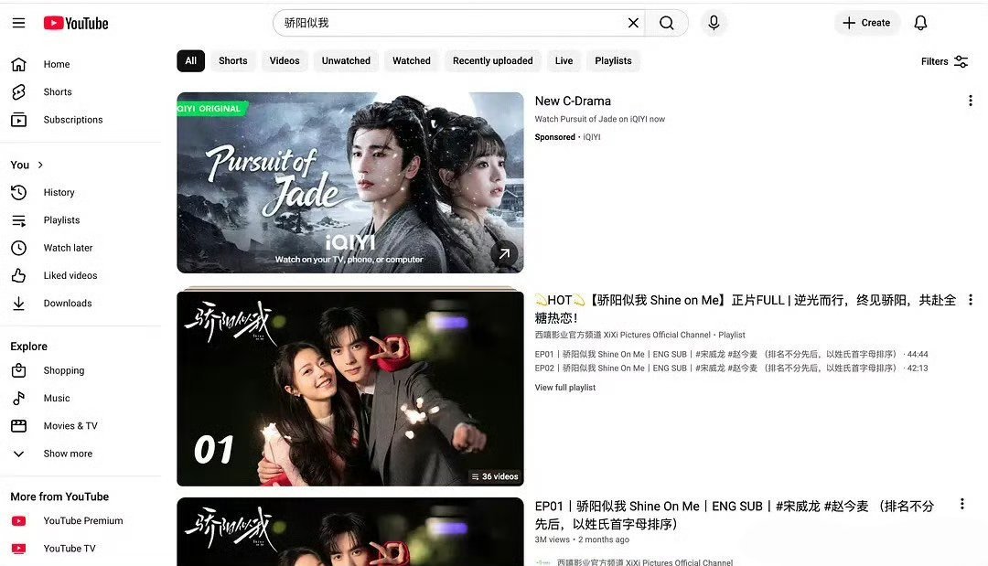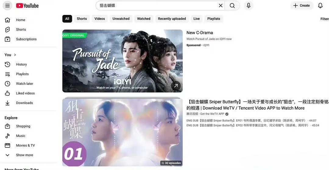 这推广方式有点流氓了吧。油管上搜骄阳、狂飙、狙击蝴蝶…出来的第一个都是逐玉。