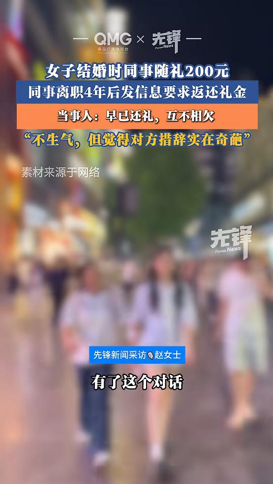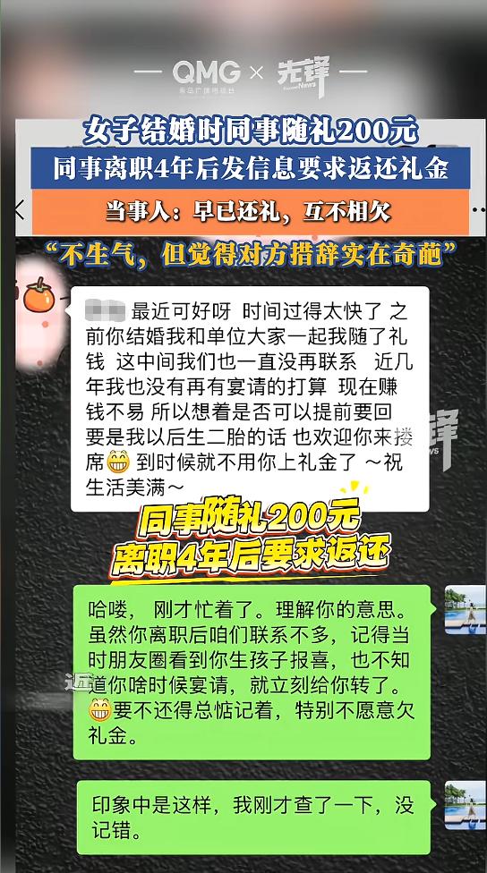 “太奇葩!”河北,女子结婚时,同事给她随了200块,过了1个月同事离职,女子看对方生了娃,就又回了200礼金,没想到4年后,同事突然给她发消息,说现在挣钱难,近几年也没有想要宴请的打算,想让女子把当初她随的200块还给她,以后如果生二胎,女子也不用上礼金了。这让女子哭笑不得……   消息弹出来时,女士刚忙完家里的事,手机一响就看到一段很长的文字。     她盯着屏幕看了几行,才反应过来对方不是寒暄,是来要钱的。     对方的意思很明确,200块想先拿回去,近几年也不打算办酒席,等以后真有二胎再请她吃席,届时她就不用再随礼。     女士没有立刻回怼,她先去翻了自己的转账记录。     记录很快就找到了,金额200元,时间停在2022年7月。     她这才把事情从头捋了一遍。     2021年9月她结婚,单位同事来捧场,有人随礼200元,其中就有这位后来离职的同事。     婚礼办完不到一个月,对方就离开了公司。     两人本来交集就不深,离职后更谈不上常联系,按多数人的习惯,这笔礼金往往就被当作一份祝福放在记忆角落里。     女士不一样,她对人情往来很敏感,总觉得欠着不舒服。     到2022年7月,她在朋友圈刷到对方生孩子的消息。     她没有等邀请,也没等对方办不办酒,直接把200元转了过去,心里想着人家已经不在一个单位了,拖得久了更容易说不清。     钱转完,对方也收了,之后两人没再联系。     四年后这条要钱的信息出现,女士第一反应不是气,是纳闷。     纳闷的点不在200元,而在于对方把已经结清的事当成了欠款来追。     她把转账截图附上,用很平静的口吻解释当年看到生子消息后就把礼金补回去了,自己不喜欢欠人情。     对方看完后又说了一句,可能是家里人代收了,自己没注意。     事情到这里,表面上就结束了。     不少人之所以对这类事有情绪,不是因为200块多大,而是份子钱在很多人心里既像礼物又像账本。     在同事关系里,这种账本更微妙。     平时一起上班,凑个份子很正常。     离职后各奔东西,往来断掉,人情就容易变成悬账。     有人选择随缘,见面再说。     有人像这位女士,主动把账清了,省得以后尴尬。     也有人会在几年后突然想起自己当年给过钱,手头紧时就萌生了要回去的念头。     问题在于,宴席这件事并不等同于借款。     同事去吃了喜宴,通常也付出了时间和社交成本。     主家办酒席也有场地餐饮等支出。     把随礼理解成可退的押金,就会出现网友常提的那句疑问,酒席吃过了怎么算。     更现实的一点是,很多人会忽略转账由谁接收。     家人帮忙收礼,事后没对账。     换手机不保留聊天记录。     只记得自己当年随过礼,不记得对方后来补过礼。     这些都可能让人产生错觉,错觉一旦叠加焦虑,就可能开口要钱。     从法律角度看,像婚礼随礼这类通常被视为一般赠与。     钱款交付完成,原则上就完成了权利转移。     想在多年后单方面撤回,通常缺少稳妥依据。     回到这件事里,女士已经在2022年7月把200元转回去,双方就算把人情账结清了。     再去要回同一笔钱,更像是记账混乱引出的误会。     这件事也给普通人一个很实用的提醒。     随礼前先想清楚三件事,关系是否会长期维持,自己是否介意收不回,转账备注是否写清楚用途。     金额不大时,备注一句婚礼随礼或生子随礼,日后对账更省心。     遇到离职同事,想还礼又怕尴尬,也可以等对方确实办席再补上,减少信息差。     真想图个心安,转账后把记录留好,别只依赖聊天窗口。     人情往来讲究体面,体面很多时候靠的不是多会说话,是把事做清楚,把证据留明白。     女士这次不争吵不拉扯,用记录把事情说明白,既保住了分寸,也把误会就地消化。     生活里类似的小插曲难免出现,能把话说清,把账对上,事情就不会越闹越大。     多数人最终想要的也不是什么赢输,只是别在一笔小钱上耗掉情分和心情。 信息来源:《女子回应时隔5年被要求返还礼金》先锋新闻