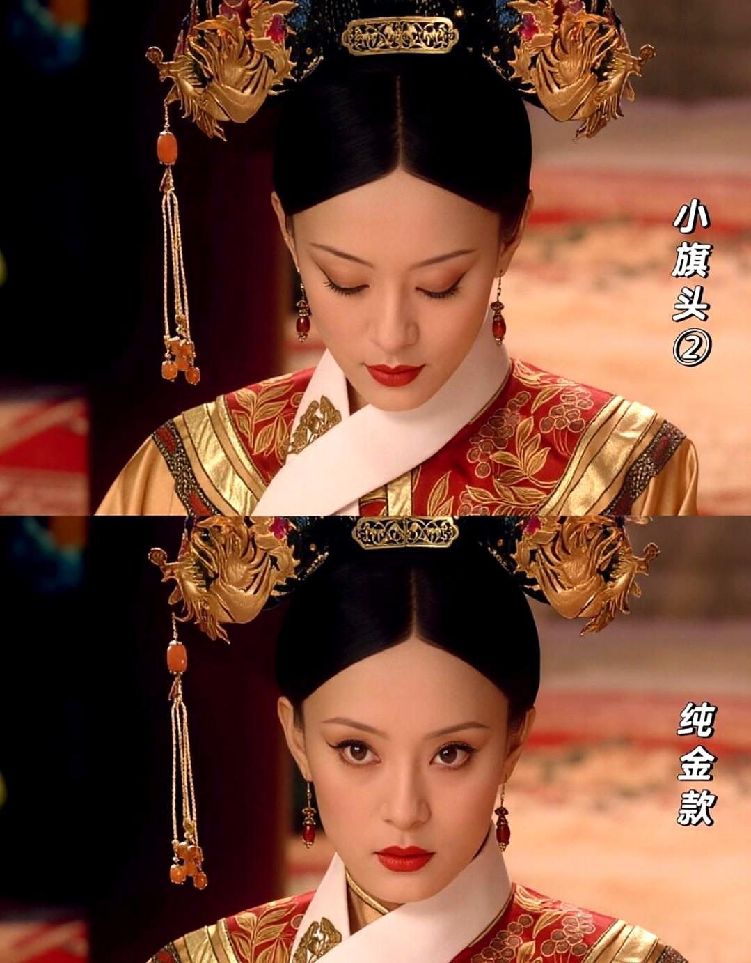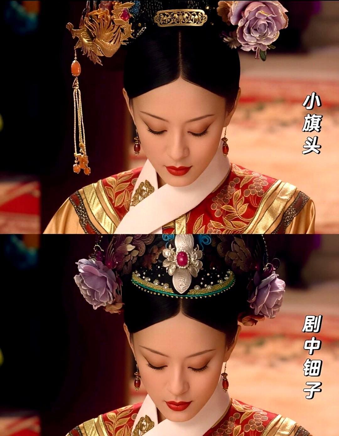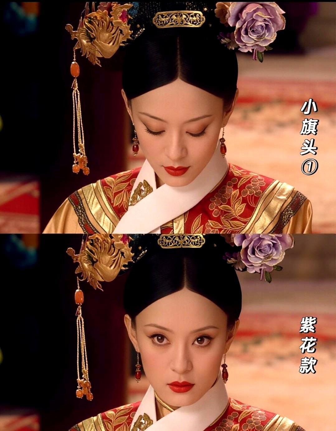 甄嬛后来再也不肯戴带流苏的小旗头了。 刚入宫时戴素银缠3颗珍珠的小旗头,眼尾