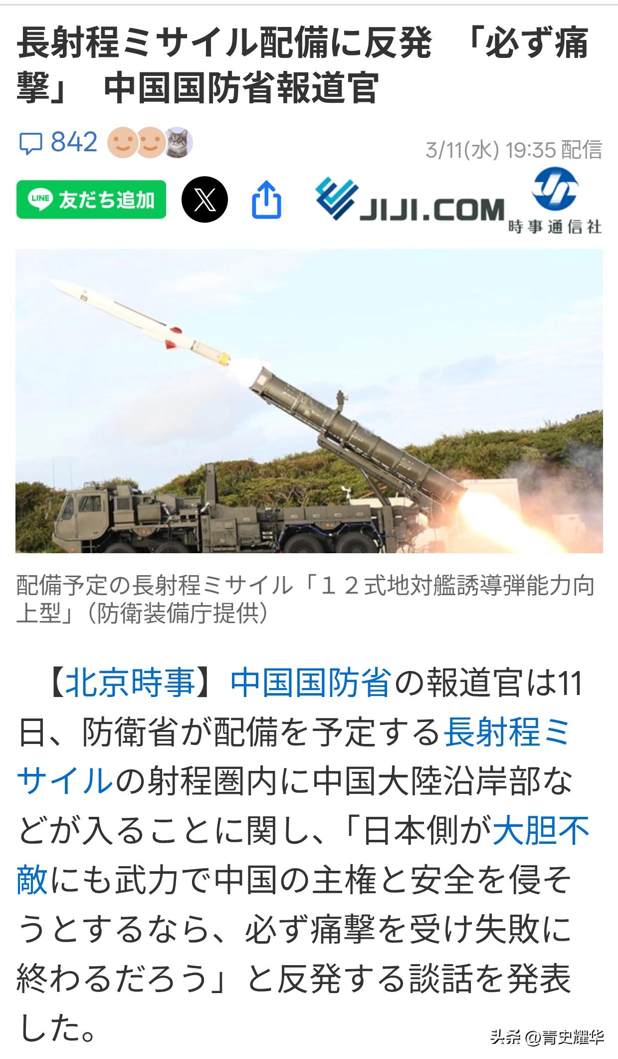 日媒迅速报道我国防部发言人讲话 3月11日这一天,日本的时事通信社等多家媒体,反应特别快,当天就迅速报道了我国防部发言人发表的重要声明。这件事的起因,就是日本防卫省最近一直在忙着部署远程导弹,而且这款导弹的射程很远,能直接打到我国的沿海地区,对我国的主权和安全造成了很大威胁,我国防部这才正式发声抗议,每一句话都掷地有声,态度特别明确。 日本战后一直有个“专守防卫”的原则,简单说就是只能搞防御性的军事力量,别人不打它,它就不能主动进攻,也不能搞那种能打很远、用来攻击别人的武器。 以前日本也一直拿这个当借口,说自己只是自卫,不会威胁到其他国家。但这次不一样了,日本防卫省部署的这款远程导弹,彻底打破了这个原则。 根据公开的消息,日本这次部署的是“12式岸舰导弹改进型”,射程能达到1000公里左右,从日本的九州岛发射,就能轻松覆盖我国东部沿海的很多地方,不管是沿海的城市,还是重要的设施,都在这款导弹的打击范围之内。 而且早在3月9号凌晨,日本就已经把这款导弹的发射装置,运到了第一个部署地点——陆上自卫队熊本市的健军驻屯地,按照计划,整个部署工作会在3月底之前完成,比原计划提前了整整一年。 更让人警惕的是,日本政府还放话,说只要认定敌方要对日本发动攻击,他们就可以在还没遭受损失之前,先动手打击对方。这就很危险了,相当于日本彻底放弃了“被动防御”,开始搞“先发制人”,这已经不是单纯的自卫了,完全是在搞进攻性的军事部署,也难怪我国防部会坚决抗议。 我国防部发言人在3月11日的声明里,说得特别清楚,没有任何含糊。发言人明确表示,日本部署这种远程导弹,已经颠覆了它自己一直标榜的“专守防卫”前提,以前大家还说日本的“新军国主义”只是一个危险信号,现在看来,这根本不是信号,而是实实在在的威胁。这句话一点都不夸张,日本近年来一直在不断扩充军力,2025年的防卫相关费用已经达到700多亿美元,提前两年完成了防卫费占国内生产总值2%的目标,不惜举债增税也要搞军事扩张,这背后就是军国主义想死灰复燃的苗头。 针对日本的这种危险行为,我国防部也发出了严厉警告:“如果日方无畏地试图以武力侵犯中国的主权和安全,必将遭受痛击,最终必将失败。”这句话不是吓唬人,是我国的真实态度,也是我国的实力底气。 这些年,我国的国防力量不断强大,就是为了捍卫国家的主权和安全,不管是哪个国家,只要敢侵犯我们,我们都有能力、有决心给予狠狠反击,绝对不会让历史重演。 日本的时事通信社之所以会这么快就报道我国防部的讲话,其实也能理解。一方面,我国的表态太硬气、太明确,日本方面不得不重视,想第一时间了解我国的立场,也想把这个消息传递给日本国内;另一方面,这件事本身就很受关注,日本部署远程导弹,不仅威胁到我国,也破坏了整个东亚地区的和平稳定,周边国家都在密切关注,日媒自然不敢怠慢。 日本为什么非要部署这种远程导弹?其实原因很简单,就是日本的右翼势力一直在推动“再军事化”,想摆脱二战后对它的军事限制,谋求成为军事强国,甚至想干涉我国的内政,配合美国的亚太战略,一起遏制我国的发展。 他们还打着“周边威胁”的借口,不断扩充军备,篡改历史、参拜靖国神社,一步步走上穷兵黩武的老路。 值得一提的是,日本国内也有很多反对的声音,熊本当地的民众,对日本防卫省不召开居民说明会就部署导弹的行为,批评声特别大,大家都不想因为这些导弹,让自己的家园陷入危险之中。 但日本政府根本不顾民众的反对,执意推进导弹部署,眼里只有自己的军事野心,这种行为既不负责任,也很危险。 我国防部的这次表态,不仅仅是针对日本部署远程导弹这件事,更是向世界表明我国捍卫国家主权和安全的决心。 我们从来不会主动惹事,但也绝对不怕事,日本要是真的敢不顾警告,凭着这些远程导弹侵犯我国的主权和安全,那肯定会遭到我们的痛击,最终只能是失败的结局。 这件事也让我们看清,现在的国际形势并不平静,日本的新军国主义抬头,已经成为地区和平稳定的严重威胁。 但我们不用害怕,我国的国防力量足够强大,我国防部的每一次表态,都有足够的实力作为支撑。我们始终坚持和平发展,但对于任何威胁我国主权和安全的行为,我们都会坚决反击,绝不手软。 日媒这次迅速报道我国防部的讲话,也从侧面说明,我国在国际上的话语权越来越重,我们的立场和态度,已经不能被任何国家忽视。