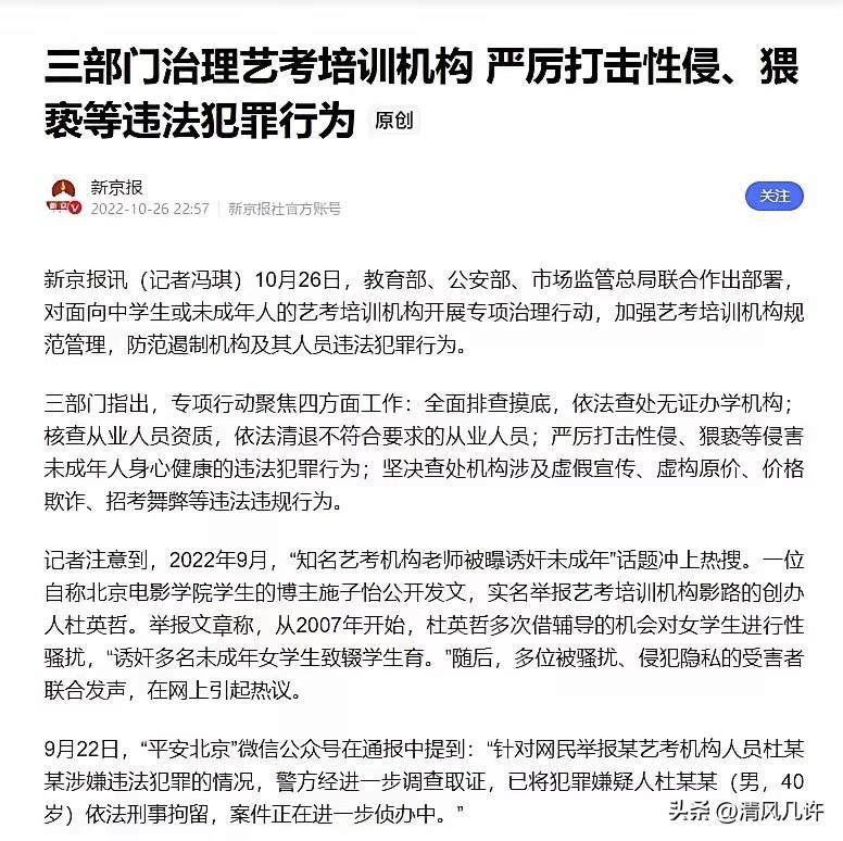 “我睡过100多个女学生。”2022年,知名艺考培训机构影路站台的校长杜英哲,曾公开炫耀,在凌辱17岁女艺考生后,在其屁股上画了一只乌龟当作胜利的标志。 这份毫无底线的炫耀,藏着长达15年的罪恶,直到2022年9月才被彻底撕开。 北京电影学院学生施子怡联合21位影路站台的前学生与员工,发布实名长文《21个艺考圈房思琪的血泪控诉》,将杜英哲的恶行公之于众。她们的控诉里没有修饰,只有冰冷的事实:从2007年起,杜英哲便利用艺考培训的权威身份,以“面试辅导”“剧本创作”为借口,将魔爪伸向未成年女学生。 他会布置《我的性幻想》这类低俗作业,以免费海外夏令营为诱饵,把女孩们带到人生地不熟的异国,实施猥亵与侵犯。更令人发指的是,他的妻子陈昕也参与其中,以“关心学生”为幌子,带女孩们泡温泉、买衣服,放松她们的警惕,再将她们推向杜英哲的魔爪。 有受害者回忆,17岁那年被杜英哲诱骗至住处,反抗后遭到更恶劣的羞辱,最终被迫辍学怀孕,18岁便生下了孩子。 还有人提到,早在2013年就有受害家长上门维权,拉横幅控诉杜英哲的恶行,却被悄悄压下,没能掀起波澜。这些女孩大多是怀揣艺术梦想的未成年人,她们害怕影响升学前途,不敢告诉家人,更不敢报警,只能在恐惧中隐忍。杜英哲正是抓住了这种心理,用“顺从就能上名校”的谎言控制受害者,让更多人陷入他的罪恶圈套。 2022年9月,随着北电学生赵韦弦索要女生私密照事件发酵,施子怡和其他受害者选择不再沉默。她们整理了聊天记录、录音、照片等证据,将完整的受害经历发布在网络上,瞬间引爆舆论。 网友们的愤怒席卷而来,大家无法想象,本该是守护艺术梦想的艺考机构,竟成了滋生罪恶的温床。杜英哲曾试图发声辩解,称举报内容存在夸大,还辩称自己“初心是好的,只是方式用错了”,这番苍白的道歉只换来更强烈的谴责——他心疼的是自己的事业与名声,从未在意过那些被毁掉人生的女孩。 9月22日,北京海淀公安发布通报,经调查取证,已将犯罪嫌疑人杜英哲依法刑事拘留,案件进入侦办流程。 与此同时,杜英哲的学生赵韦弦也因涉嫌违法犯罪被刑拘,他曾以拍摄为由向200多位女生索要私密照片,进一步坐实了影路站台内部的腐朽生态。消息传出后,不少受害者终于敢站出来发声,她们说,等这一天等了太久,哪怕只是让更多人看清真相,也值得了。 事件的持续发酵,终于推动了行业层面的整治。10月26日,教育部、公安部、市场监管总局联合部署专项治理行动,将矛头直指面向中学生与未成年人的艺考培训机构。 行动明确要求,全面排查无证办学机构,清退不符合资质的从业人员,严厉打击性侵、猥亵等侵害未成年人的犯罪行为,同时查处虚假宣传、招考舞弊等违规操作。相关部门还开通了专项举报窗口,鼓励受害者与知情者提供线索,对每一条线索逐一核实处理。 这场专项治理并非只针对杜英哲一人,而是要彻底清扫艺考培训行业的隐秘角落。 此前,艺考培训因与名校升学挂钩,形成了封闭且权力不对等的生态:机构和老师掌握着学生的升学希望,未成年学生缺乏社会经验,很容易被PUA与控制。杜英哲能作恶15年未被发现,正是利用了这种生态漏洞——受害者害怕影响前途不敢发声,家长们为了孩子的未来选择隐忍,让罪恶得以长期隐藏。 专项治理行动开展后,各地陆续排查出大量问题机构。 仅阶段性数据就显示,全国摸排了近4000家艺考培训机构,取缔116家无证机构,清退31名有违法犯罪记录的从业人员,收到并处置834条问题线索,其中涉及性侵的线索全部移送公安机关。这些数字背后,是无数家庭的安心,也是对潜在作恶者的震慑。曾经被视为“潜规则”的侵害行为,终于被摆到阳光下,接受法律与道德的审判。 杜英哲的案件仍在司法流程中,最终判决尚未公布,但他的恶行已经彻底摧毁了自己的人生,也给整个艺考行业敲响了警钟。 那些被他伤害的女孩,有的还在努力修复心理创伤,有的重新拾起艺术梦想,她们的勇气让更多人意识到,面对侵害,沉默只会纵容罪恶,发声才能换来改变。 这场由受害者发起的反抗,最终推动了行业的净化与制度的完善。它告诉我们,无论披着怎样的权威外衣,罪恶终究会被揭露;无论隐藏得多么隐秘,正义终将到来。艺考的本质是追逐艺术与梦想,不该被权力与欲望玷污,更不能成为侵害未成年人的温床。 各位读者你们怎么看?欢迎在评论区讨论。