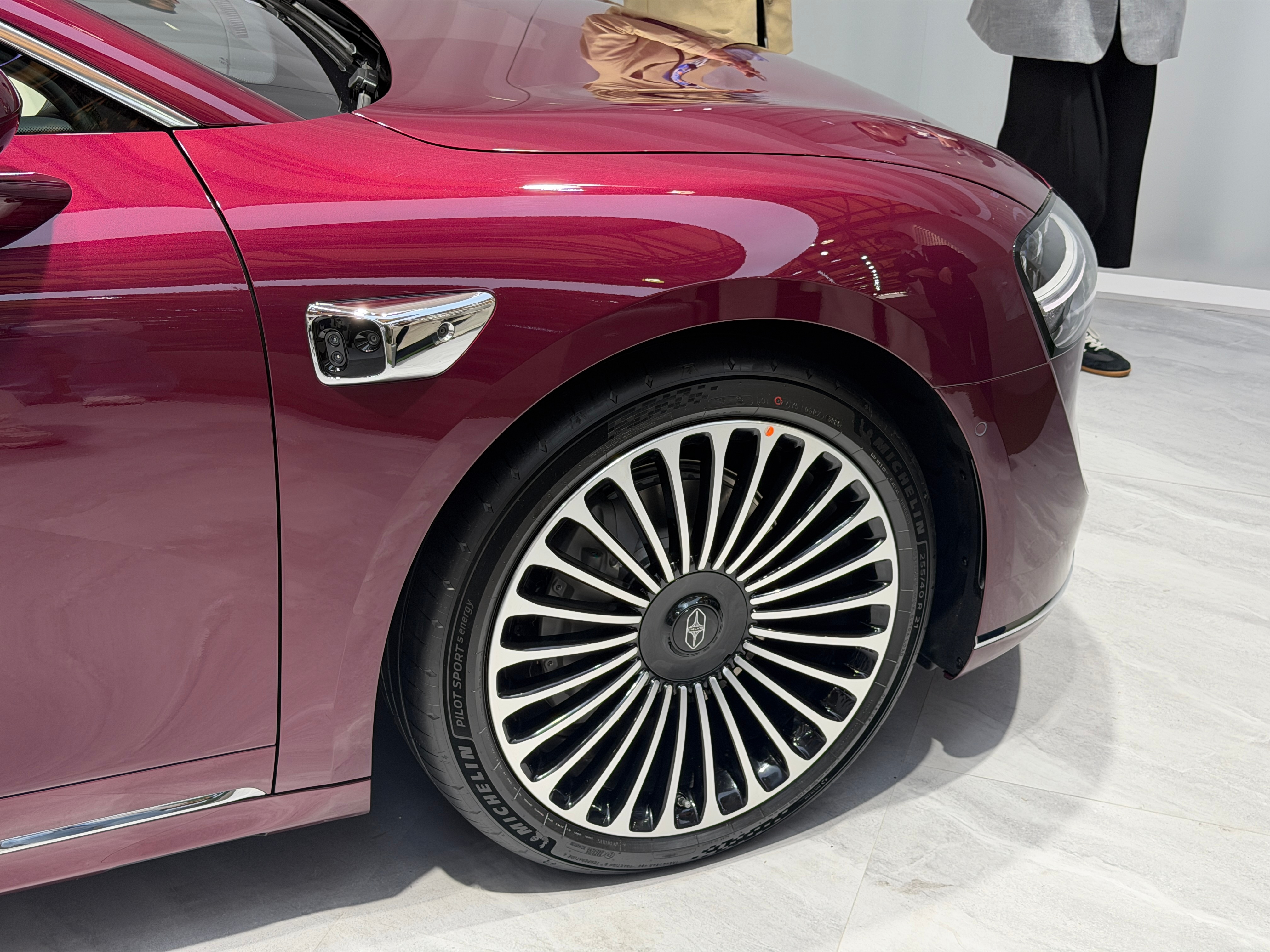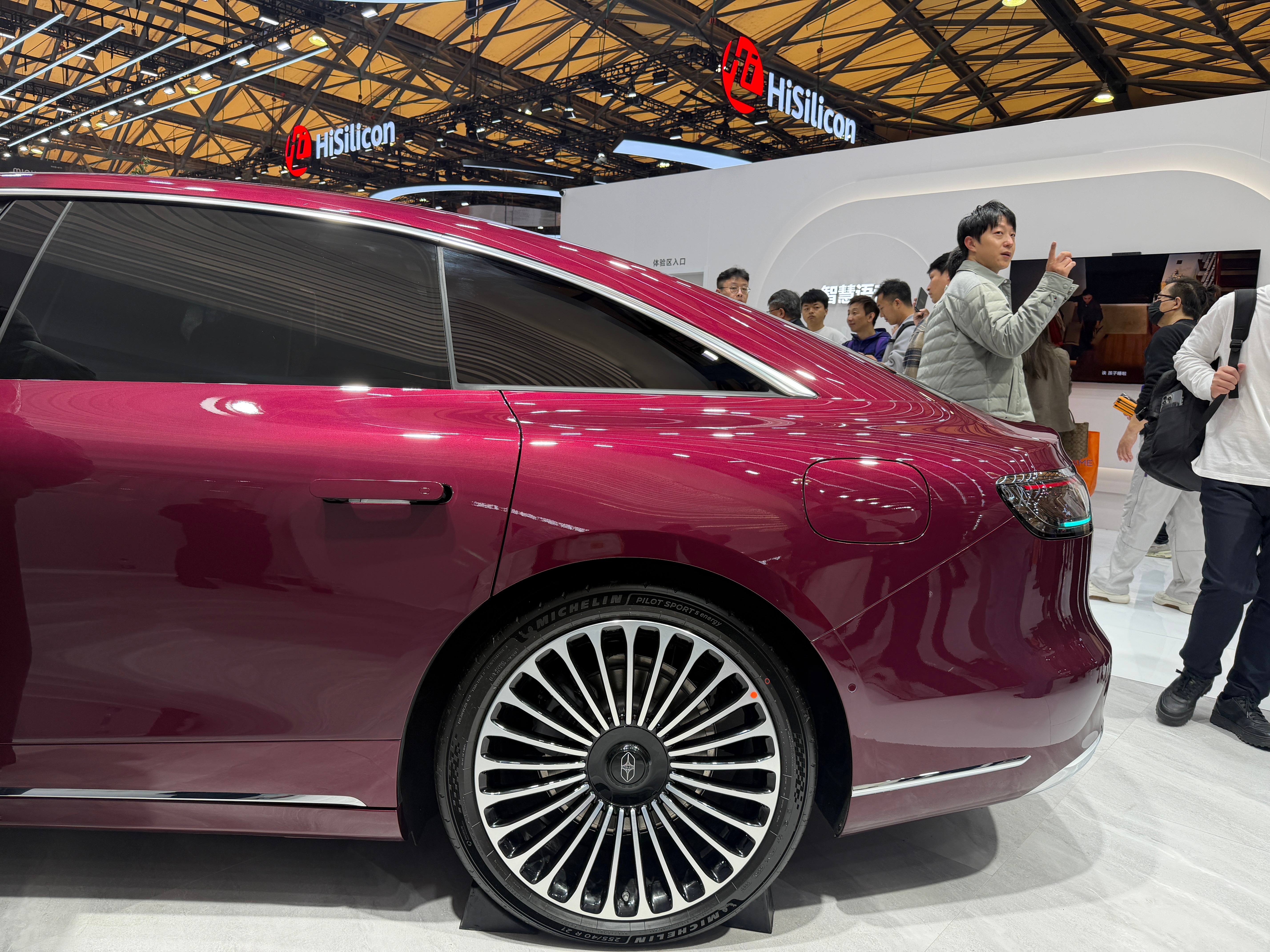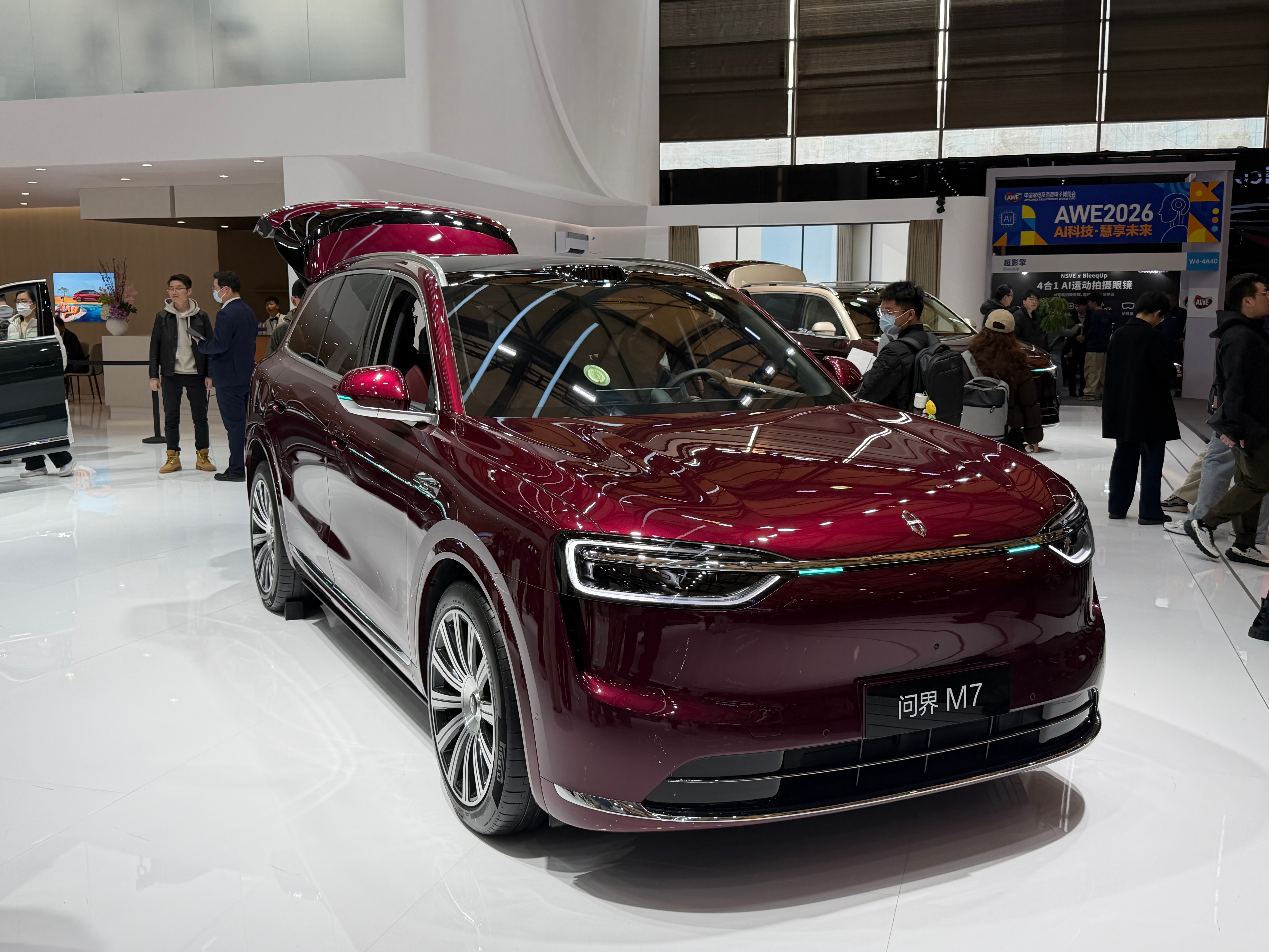 现场能看到问界M7、尚界H5、智界R7、享界S9T这些车型,在鸿蒙智家区域还单独放了一辆酒红色的享界S9,颜色确实挺吸睛的。人实在太多了,我就给大家多拍点细节。