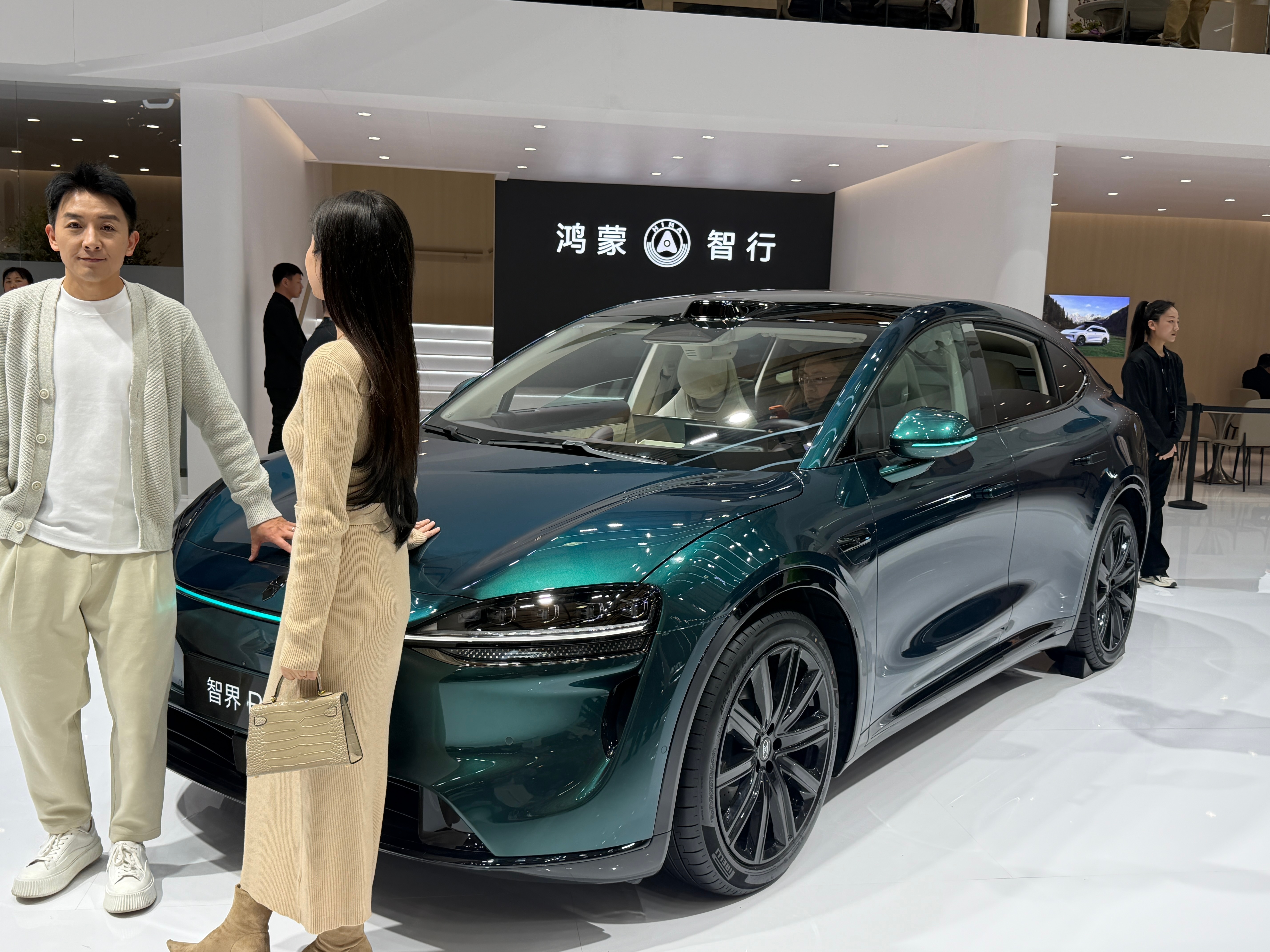 智能汽车现在已经算是智慧家庭的一部分了,所以这次在鸿蒙智家展区,华为干脆把鸿蒙智行的车也一起搬来了,感觉像是提前逛了一圈北京车展。