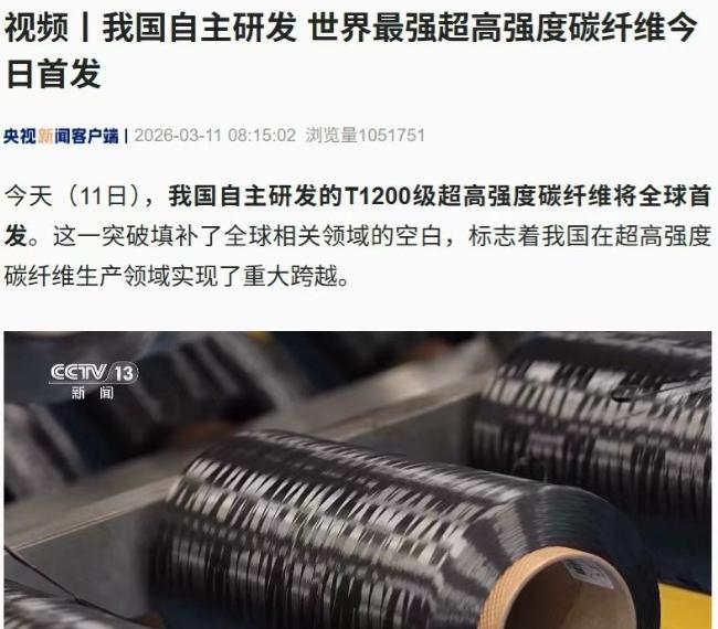 这可是真的遥遥领先全世界的咱中国自主研发! 3月11日,央视等权威媒体披露了一个天大的好消息,咱中国自主研发的T1200级超高强度碳纤维,正式全球首发了! 这可不是什么不起眼的小突破,而是实实在在填补了全球相关领域的空白,标志着咱们国家在超高强度碳纤维生产领域,实现了历史性的重大跨越,真正做到了遥遥领先全世界,而且这所有的技术,全是咱中国人自己搞出来的,没有半点外来技术依赖。 这种T1200级超高强度碳纤维,别看名字有点拗口,却是个实打实的“宝贝”,在很多关键领域都离不开它。 以前,这种级别的超高强度碳纤维,全世界都只有少数几个国家能研发,而且人家把核心技术看得死死的,不仅不卖给咱们高端产品,还对咱们实行技术封锁,就是怕咱们掌握这项技术,卡咱们的脖子。 早年间,咱们国家在高端碳纤维领域,处处受制于人。不管是航空航天、高端装备,还是新能源、医疗器械这些关键领域,只要用到高强度碳纤维,就只能花高价从国外进口。 人家不仅卖得贵,还经常限制数量,有时候甚至故意刁难,让咱们想买都买不到。那时候,咱们没有自己的核心技术,只能被动接受,那种被人卡脖子的滋味,真的不好受。而且国外的技术封锁,也让咱们很多高端装备的研发,一直受到限制,没法实现真正的自主可控。 但咱们中国人从来就不怕困难,别人越是封锁,咱们就越要努力突破。这次全球首发的T1200级超高强度碳纤维,是中国建材旗下中复神鹰的科研人员,花了十几年时间,一步步钻研出来的。 这些科研人员,日复一日泡在实验室和生产车间,做了上千次、上万次试验,克服了一个又一个技术难题,从原丝的制备,到高温碳化的工艺,再到规模化生产的各个环节,每一步都靠自己摸索,终于实现了重大突破。 这款T1200级超高强度碳纤维,有很多实实在在的优势。它的单丝直径特别细,还不到咱们头发丝的十分之一,肉眼几乎很难分辨,但强度却高得惊人,拉伸强度能达到8000兆帕以上,相当于普通钢材的10倍,而重量却只有钢材的四分之一。 更难得的是,它不是实验室里的“稀罕物”,而是已经实现了百吨级的规模化量产,能真正用到实际生产中,满足各个领域的需求。 这次T1200级超高强度碳纤维的全球首发,意义可不一般。它让咱们国家成为了全球首个实现该级别碳纤维工程化量产的国家,一举填补了全球相关领域的空白,打破了国外企业的长期垄断。 这不仅意味着咱们再也不用依赖进口,不用看别人的脸色,还能节省大量的进口资金,更重要的是,它标志着咱们国家在高性能碳纤维领域,实现了从技术到装备、从实验室到工程化量产的全链条自主可控,真正从“跟跑”变成了“领跑”。 很多人可能不知道,研发这种高端碳纤维有多难。它的生产流程长达1000多米,需要3000多个精密工艺实时精准控制,温度、张力的控制都要精确到极致,稍有偏差,整批产品就会报废。 而且以前,从高精度纺丝机到高温碳化炉,所有的生产设备都被国外封锁,咱们只能从0到1,自己研发设备、摸索工艺,其中的难度可想而知。但咱们的科研人员,没有退缩,一点点攻克难关,终于走出了一条属于中国自己的高端碳纤维研发之路。 据了解,现在咱们国家的碳纤维产能已经占到了世界总产能的一半左右,稳居全球第一,而且形成了从基础研究、技术研发,到规模化生产、下游应用的完整产业体系。 10年前,咱们国家碳纤维的国产化率还只有13.4%,而到了2025年,这个数字已经超过了92%,这样的进步,离不开每一位科研人员的默默付出。 这次T1200级超高强度碳纤维的全球首发,虽然只是一次材料领域的突破,但它背后,是咱们国家科技实力的不断提升,是咱们中国人自主研发、自强不息的精神体现。就像之前太原舰在远海从容应对外舰挑衅一样,这次的技术突破,也让咱们在高端制造领域,多了一份底气和自信。 以前,国外总以为能靠技术封锁,困住咱们的发展,但他们打错了算盘。咱们中国人,从来就有不服输的劲头,别人能做到的,咱们能做到,别人做不到的,咱们也能努力做到。 这次T1200级碳纤维的突破,就是最好的证明。它告诉全世界,中国的自主研发能力,已经越来越强,中国造,已经不再是以前的样子,而是真正能走向世界、引领世界的高端产品。 对于咱们老百姓来说,这项突破也和咱们的生活息息相关。以后,咱们能用到更轻便耐用的医疗器械,能开上续航更长的新能源汽车,能用到性能更好的体育用品,这些都离不开这种高端碳纤维的支撑。 而更重要的是,国家的科技强大了,咱们的生活才能更安稳、更有底气,咱们才能真正为自己是中国人而自豪。