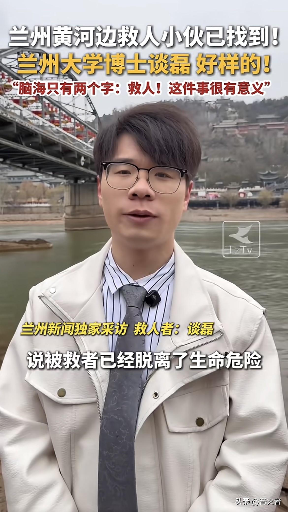 救人英雄找到了,当时她被湍急水流迅速冲离岸边,就在这危急时刻,兰州大学博士谈磊挺身而出。他听到呼救声,毫不犹豫跳入冰冷黄河。尽管初春水温极低,他仍奋力游向落水者,拼尽全力将其拉住,在岸边群众配合下,成功营救女子,事后谈磊表示特别害怕,但他的勇敢令人钦佩。谈磊,这位穿正装打领带救人的99年小伙,真的好样的!