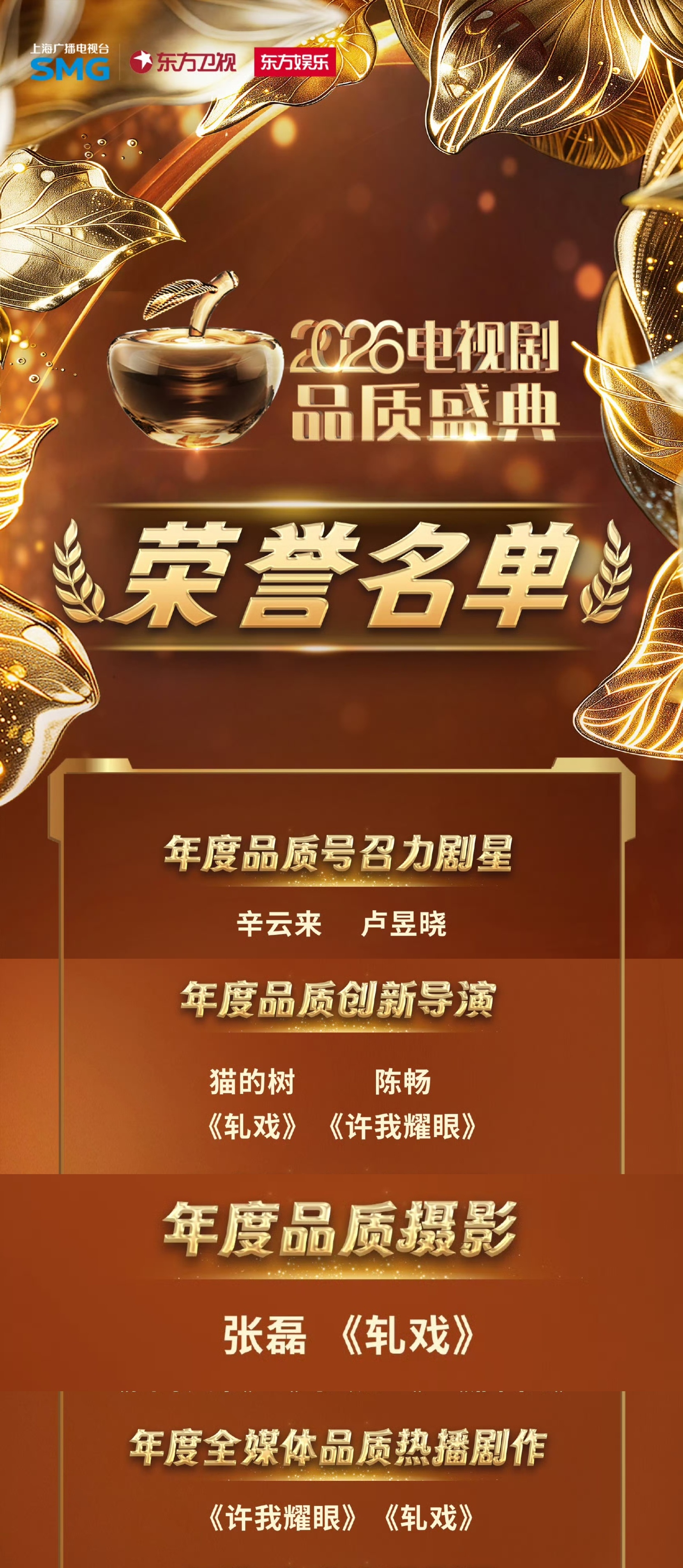 恭喜《轧戏》!昨晚东方卫视电视剧品质盛典上一口气拿下四项荣誉,年度全媒体品质热播剧作,卢昱晓收获年度品质号召力剧星,猫的树斩获年度品质创新导演,张磊摘得年度品质摄影。🎉