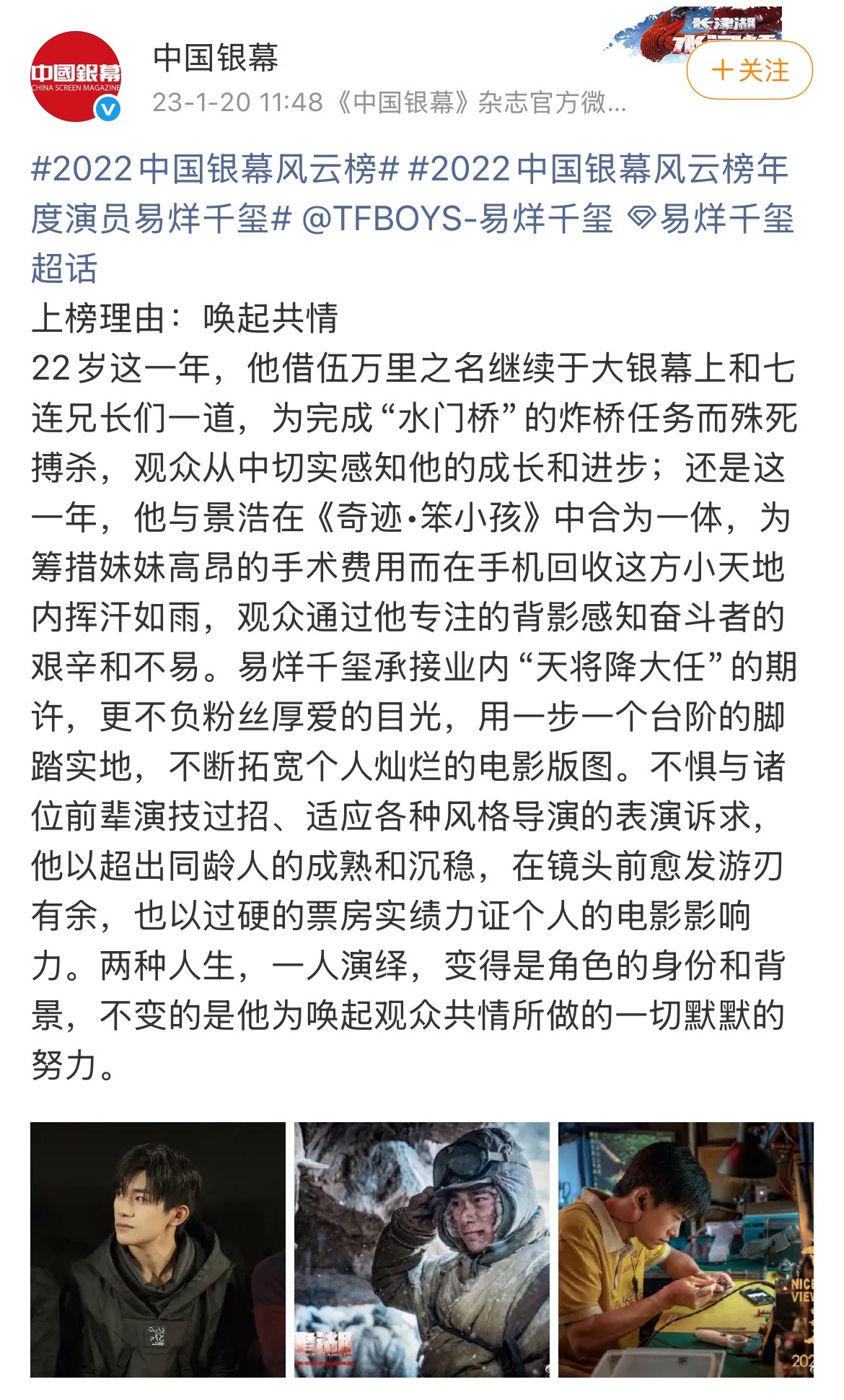 易烊千玺2025中国银幕风云榜年度演员 易烊千玺上榜2025中国银幕风云榜年度演员“上榜理由:锋芒毕露 问鼎影帝!”从2019《少年的你》到2025《狂野时代》,用一个接一个的实力作品获得多次年度演员,演员易烊千玺