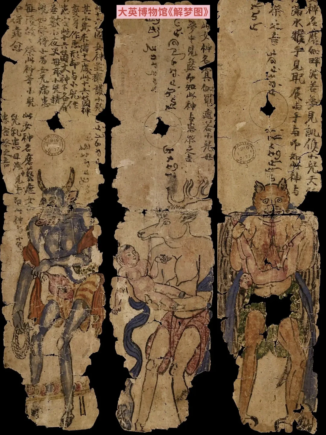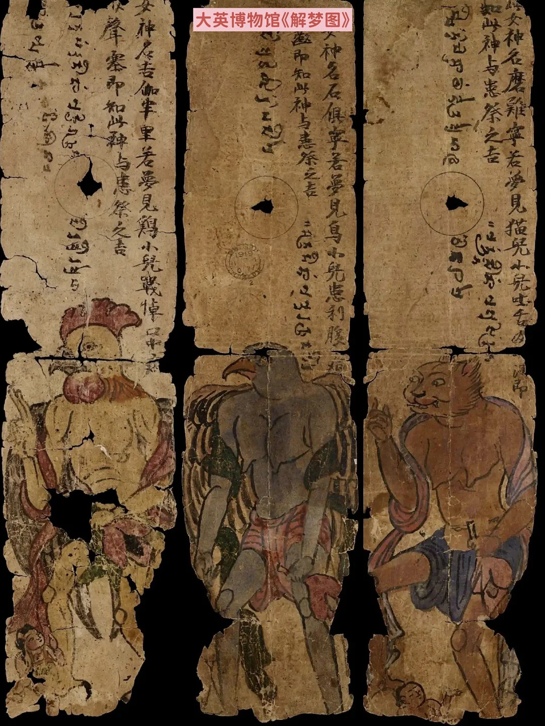 在大英博物馆,还收藏着一组解梦图很有意思,画中有着各色兽首人身像,上面写着解梦语,诸如:此女神名吉伽半里。若梦见鸡,小儿战悼口中病声塞,即知此神与患,祭之吉。