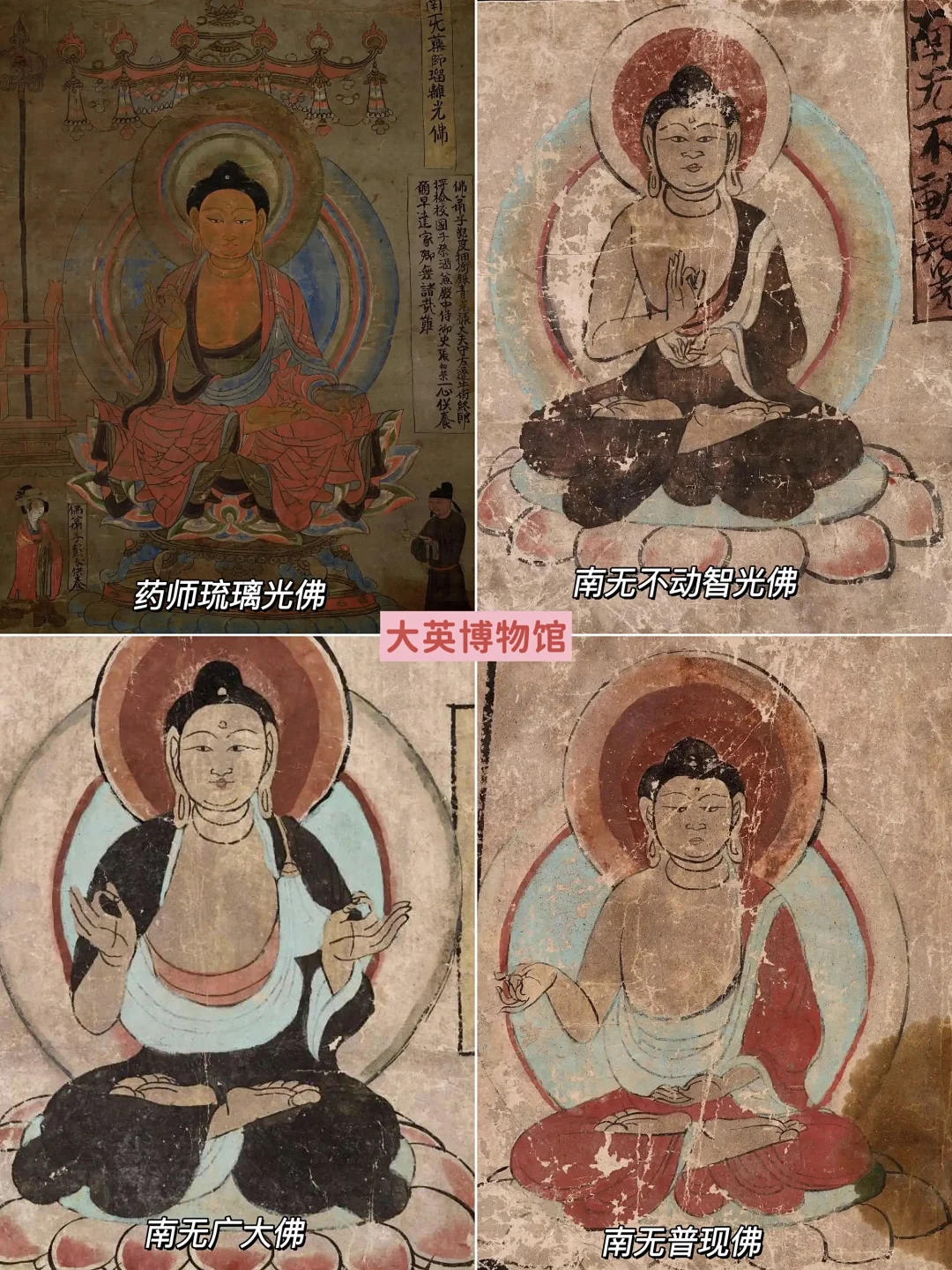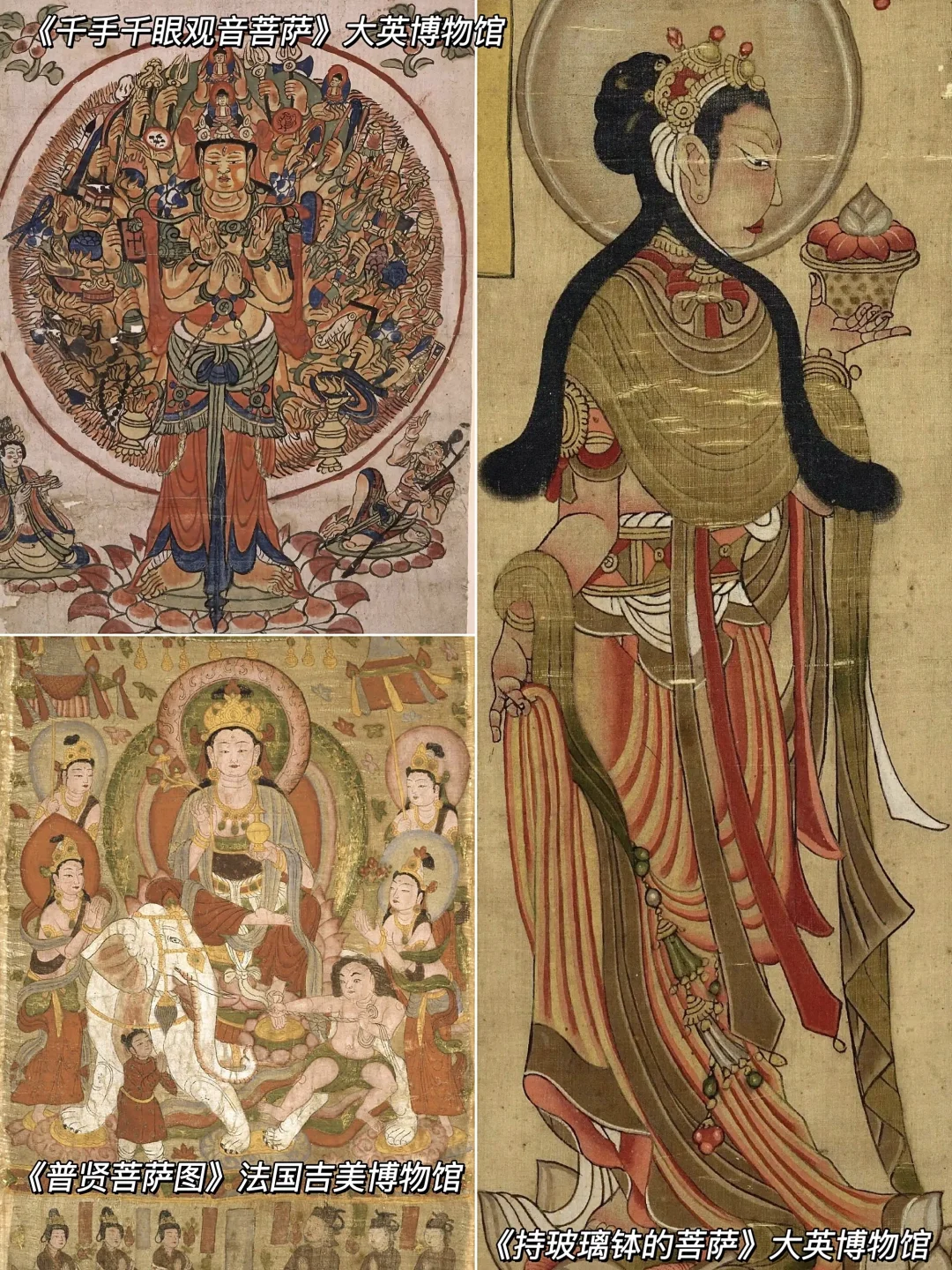 还有千手千眼的观音菩萨、水月菩萨、普贤菩萨、持玻璃钵的菩萨,以及药师琉璃光佛、南无不动智光佛、南无广大佛、南无普现佛等等精美画像,显现出印度与中国风格的融合。