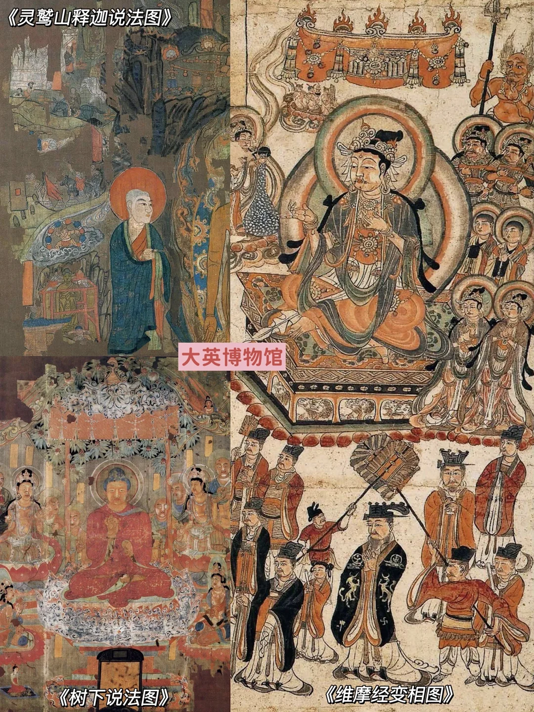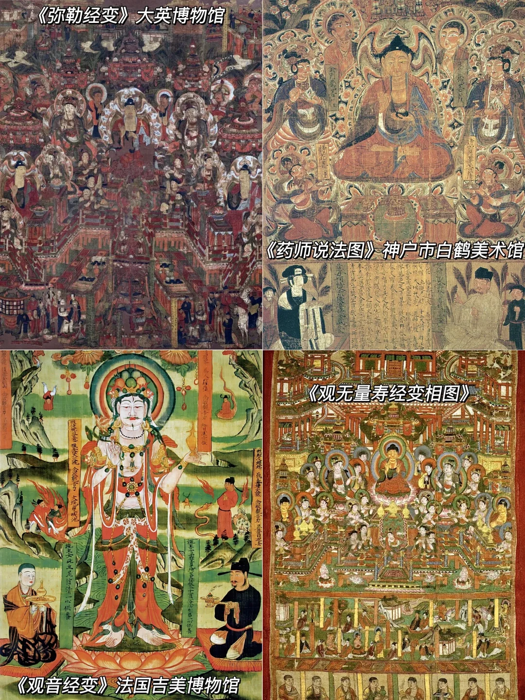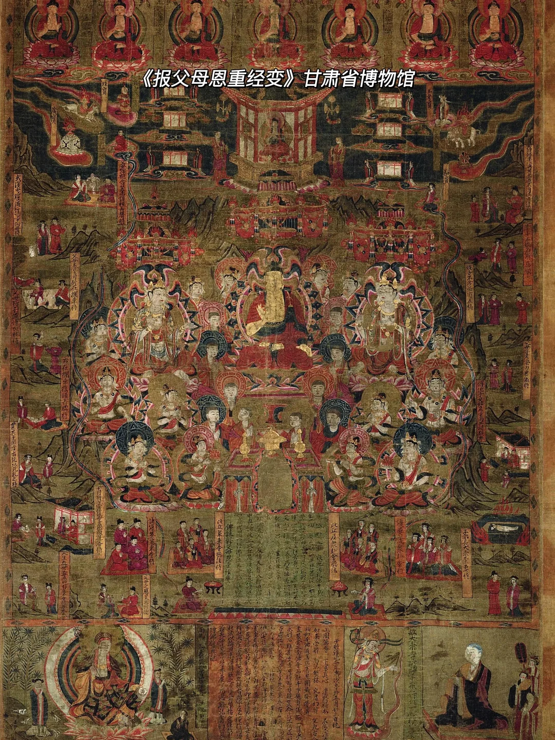 🔶还有一些图为说法图和描述佛经内容的经变画,像唐代的《树下说法图》、《弥勒经变》,五代的《维摩经变相图》、《药师说法图》,宋代的《报父母恩重经变》《观音经变》等等,这些画融入了人物、建筑和山水画技巧,展示出爆炸般的信息量。