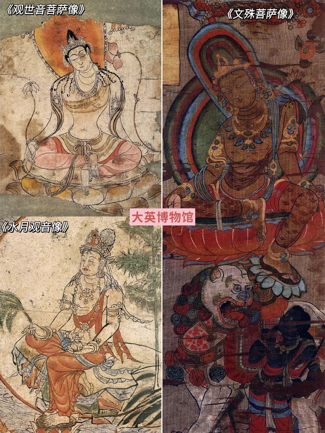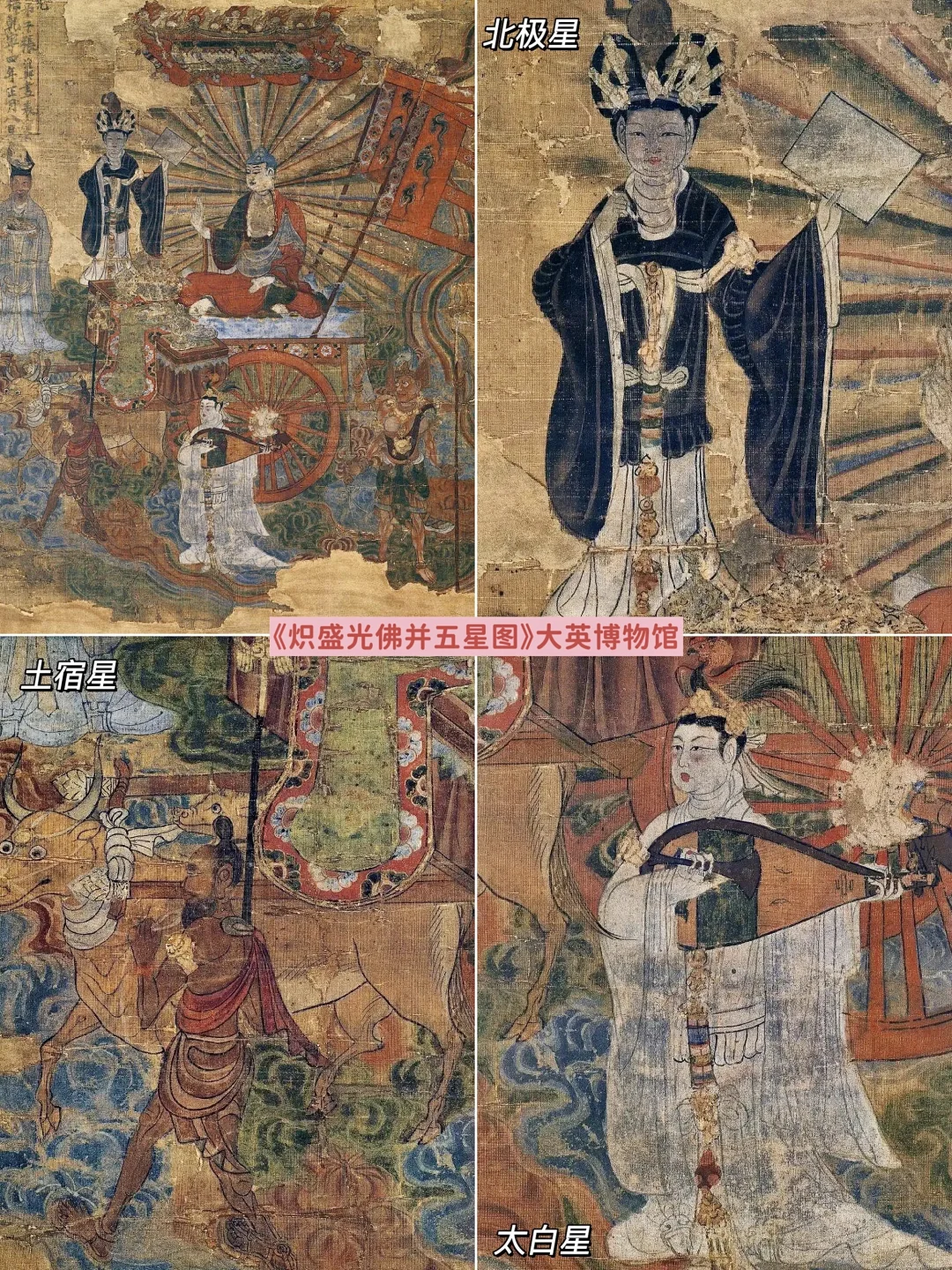 🔶关于佛像和菩萨的绘画也特别多,有坐着狮子,手持宝剑,代表智慧的文殊菩萨;有释迦牟尼的教令轮身炽盛光佛,周围环绕着人物化的“东南西北中”五星