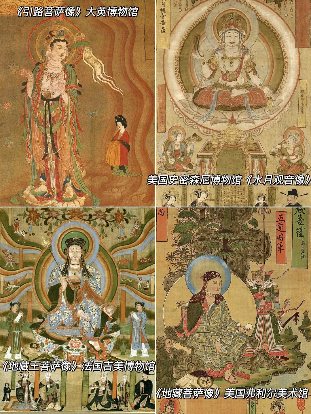 也有手持莲花、长幡,引导亡灵往生净土的引路菩萨;左手持宝珠、右手持杖,坐于青莲花上的地藏菩萨