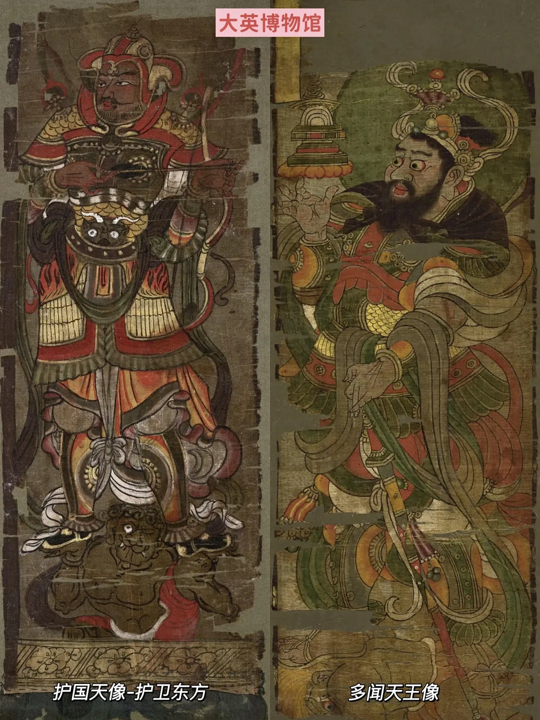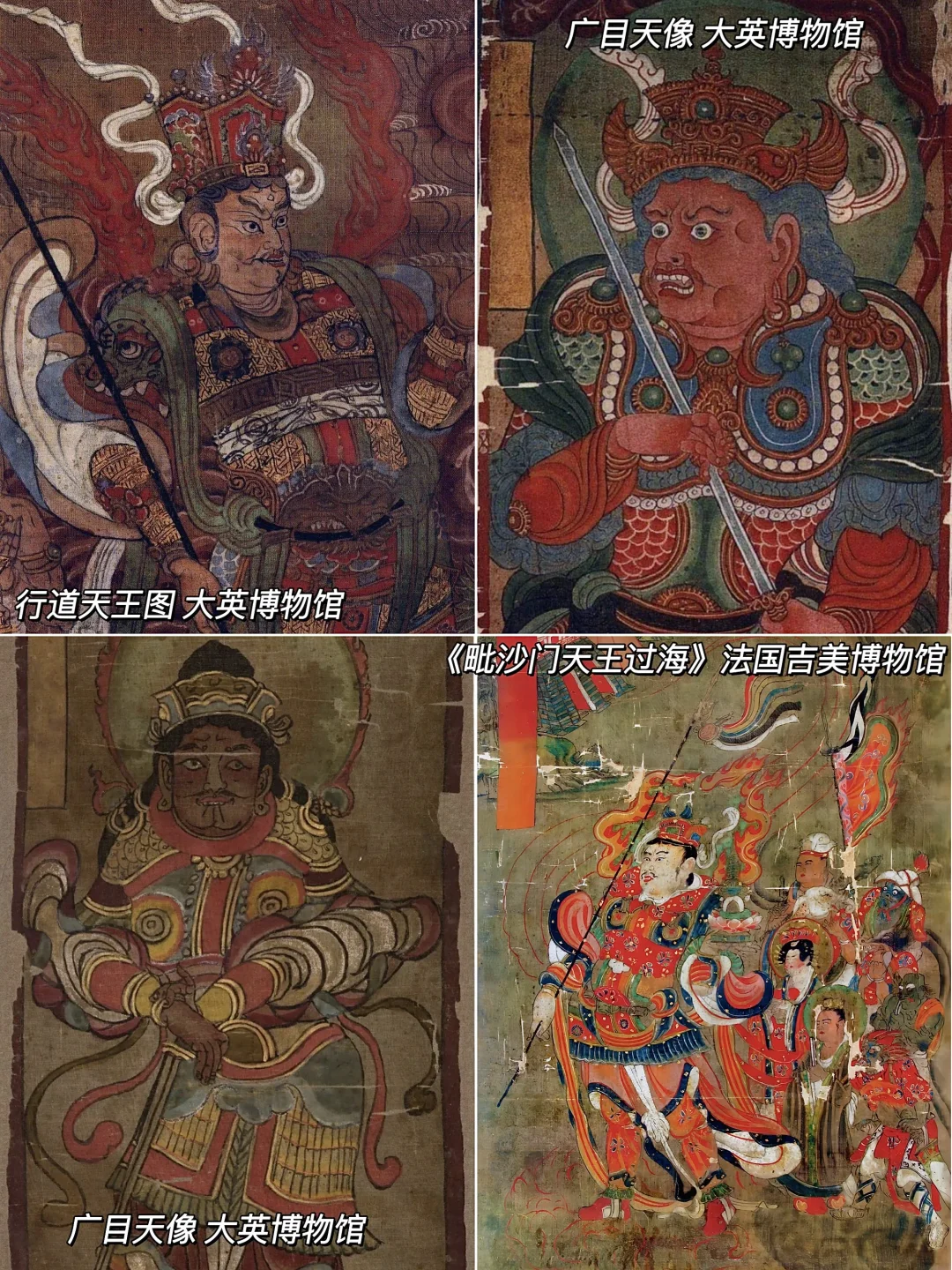 🔶另外,天王像虽然较少,也很有价值。四大天王一律呈武士状,顶盔贯甲,脚踏鬼怪,他们在体态,服饰和姿势上都很一致,所持法器略有不同,北方毗沙门天王持戟,东方持国天王持弓或箭,南方增长天王持棒,西方广目天王持出鞘的宝剑。