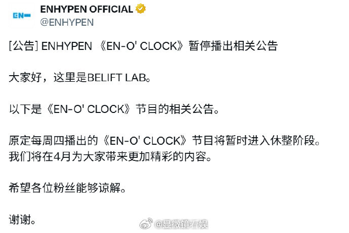 ENHYPEN团综暂停播出 ENHYPEN团综《EN-O'CLOCK》正式宣布暂停播出。根据最新安排,节目即日起进入休整阶段,近期将停止更新。据悉,该综艺计划于4月份重新启动。