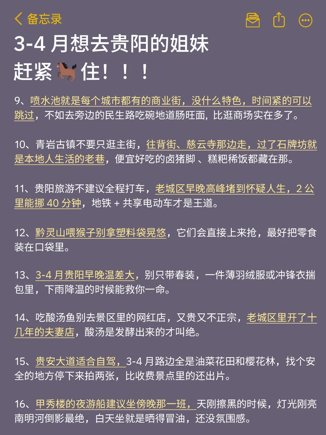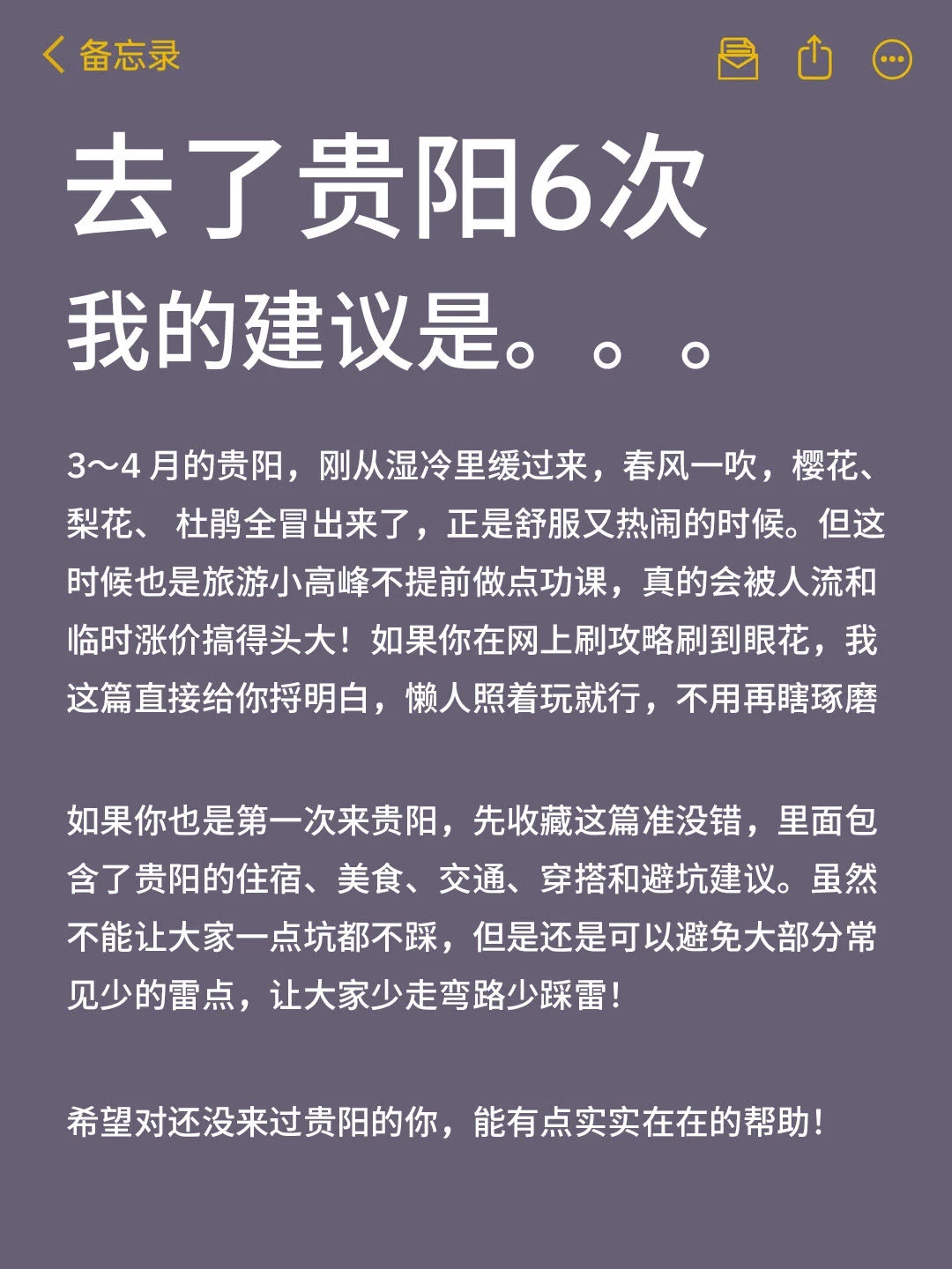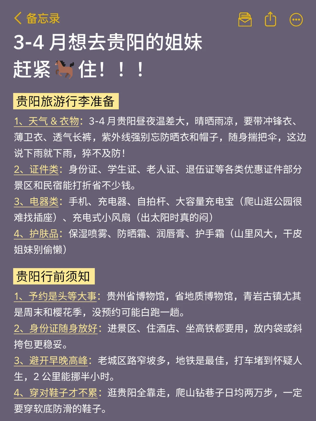 如果准备最近或者清明假期来贵阳玩的姐妹们,这篇真的要看看哦,现在的贵阳没有冬天冷,但是温差还是大的,而且还有很多注意点,要做好攻略哦!这篇干货可以直接抄作业,少走弯路多拍照!