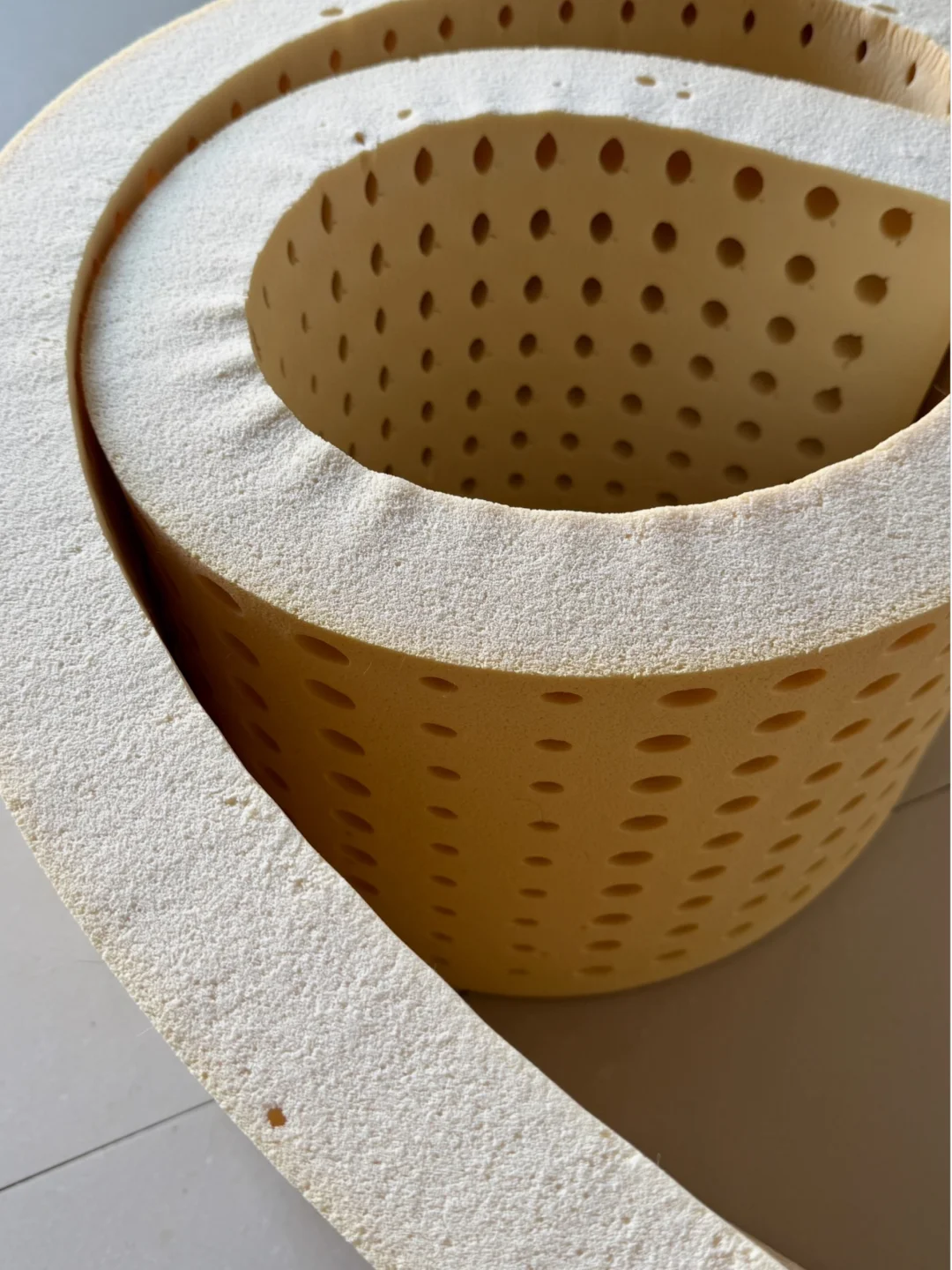 这是一个广州花都的一个客户购买的乳胶床垫,使用4年多后需要改小,拿到我们仓库修改后拍的真实照片,2022年1月份购买,拆开切割的时候朝上的一面比较黄,朝下的一面微黄,切开后内部变化不大,客户说房间朝南,经常日晒,床垫没有出现塌陷,没有粉化,没有异味,现在换房子了改成1.5米的床继续用。
