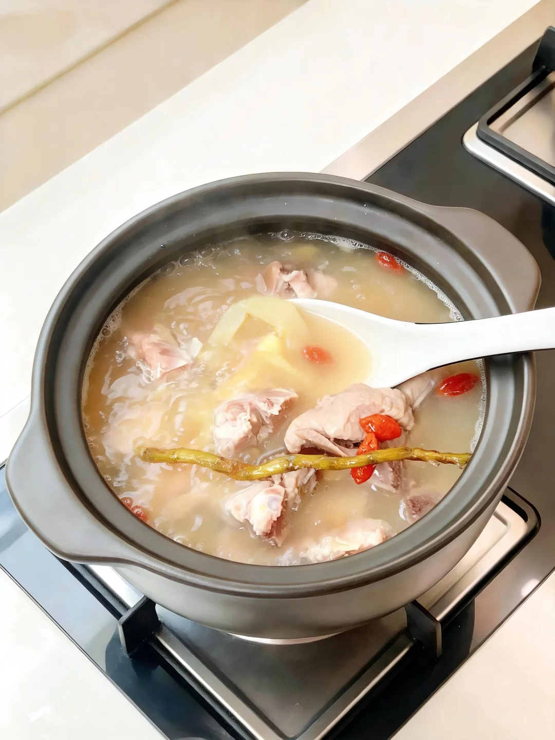 ▪️关火前5分钟下盐调味,撒入枸杞。好喝😋