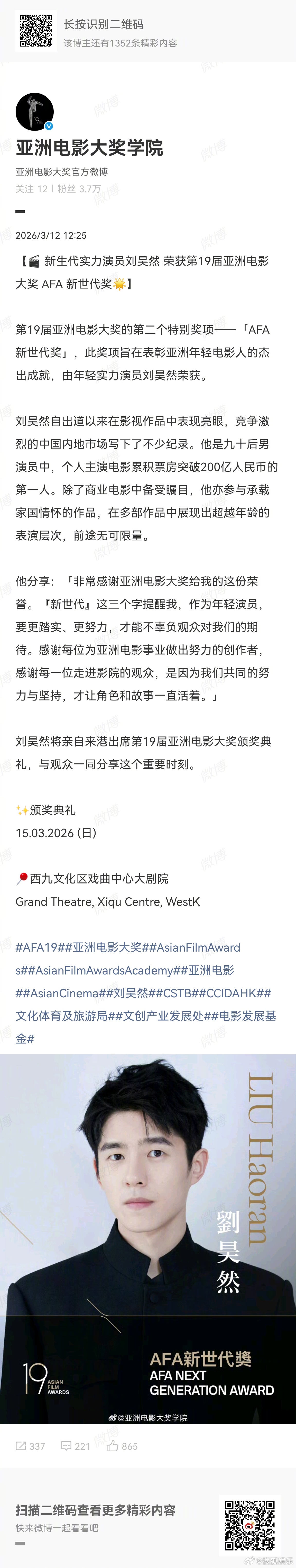 刘昊然荣获AFA新世代奖据,新生代实力演员荣获第19届亚洲电影大奖AFA新世代奖。