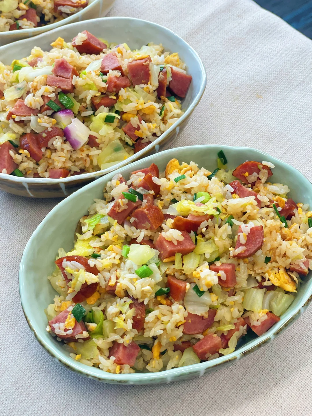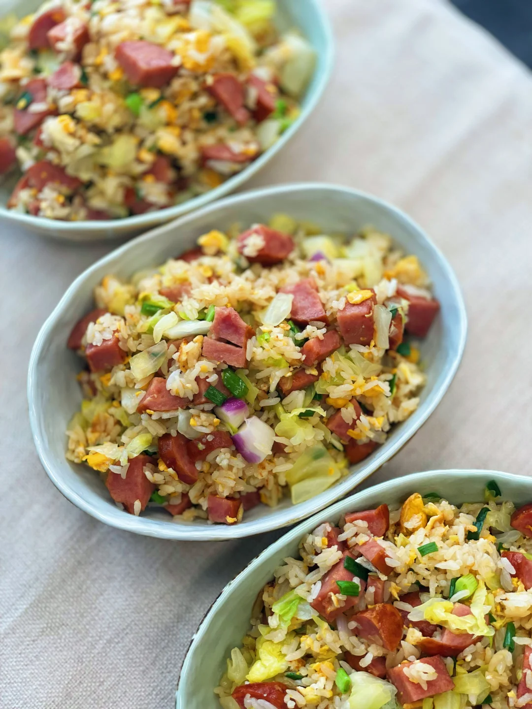 的三餐四季 🌟肉肠包菜炒饭 肉肠|包菜|鸡蛋|米饭|香葱|生抽|盐 1️⃣鸡蛋发散炒香、肉肠炒香,煎炒至表面微黄 2️⃣加入包菜炒软,生抽、盐调味 3️⃣加入米饭炒匀,最后撒上葱花即可 ❤️炒饭特别建议用不粘锅,这样可以控制油的摄入。这个炒饭就在第一步炒鸡蛋的时候放了少量的油,属于低油版本的。 ❤️包菜炒软后自带青菜的甜味,肉肠也是有调味的,生抽和盐少量添加即可。 ❤️用的是纯肉肠,还可以用午餐肉、虾仁等来替换哦!