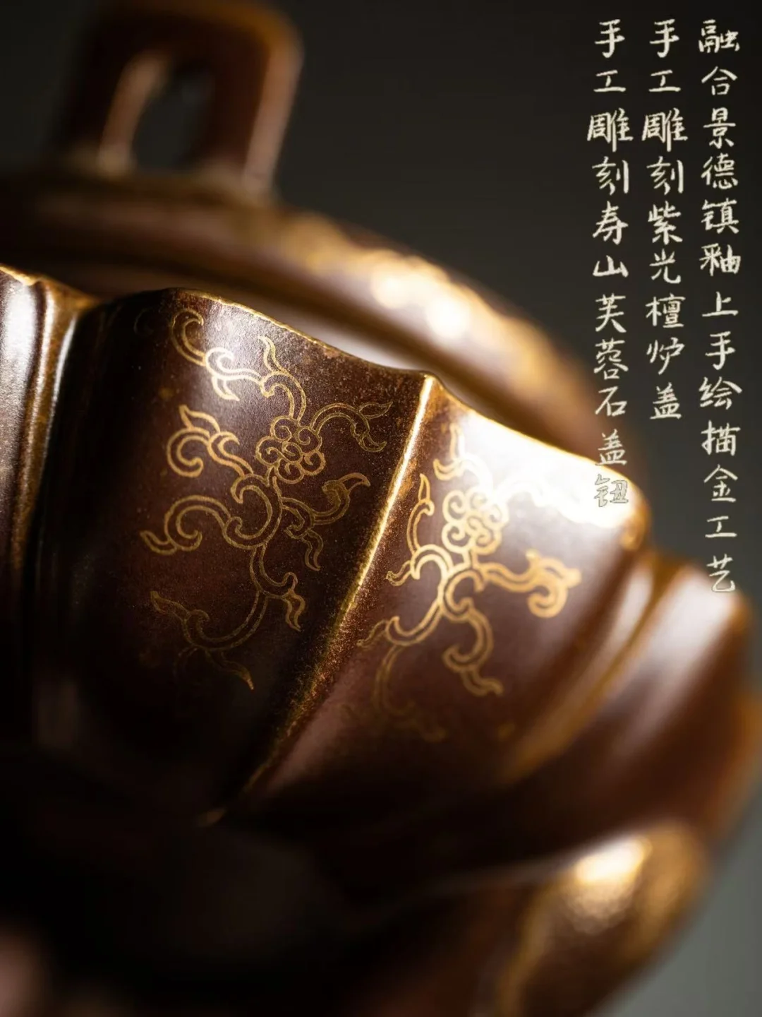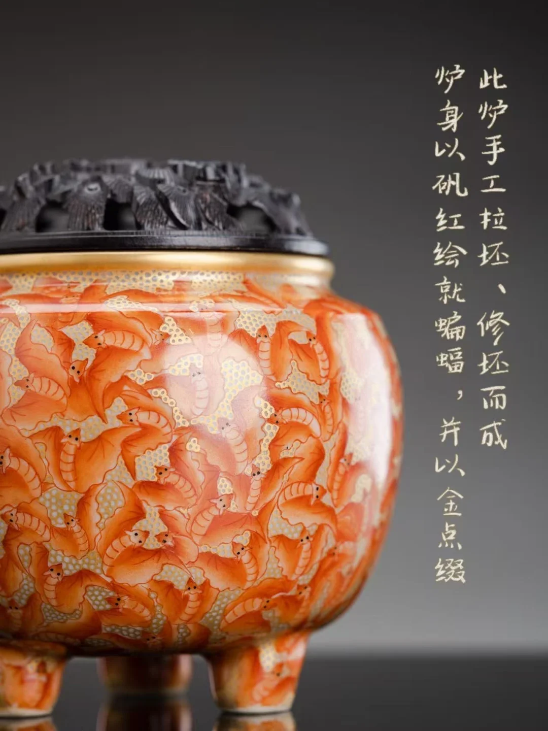 通体矾红描绘蝙蝠,一只只,一群群,“蝠”就是“福”。口沿描金,鼓腹圆润,摆在案头,满眼都是喜气。点不点香,它都在那里说着那句老话:万福金安。