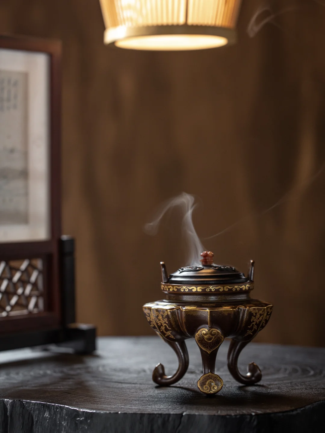 炉足是如意玉带钩的造型,一眼就能认出“如意鼎盛”的好彩头。紫光檀的盖子压得住这份贵气,放在书房里,稳重大方。老人家看着,心里也踏实。