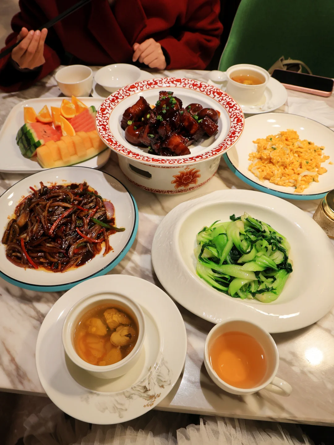 和朋友住在湖州高铁站附近的希尔顿花园酒店,打车7分钟就到了,去景点也很方便。晚餐在酒店餐厅吃的,各种湖州美食做的还不错,套肠红烧肉很绝