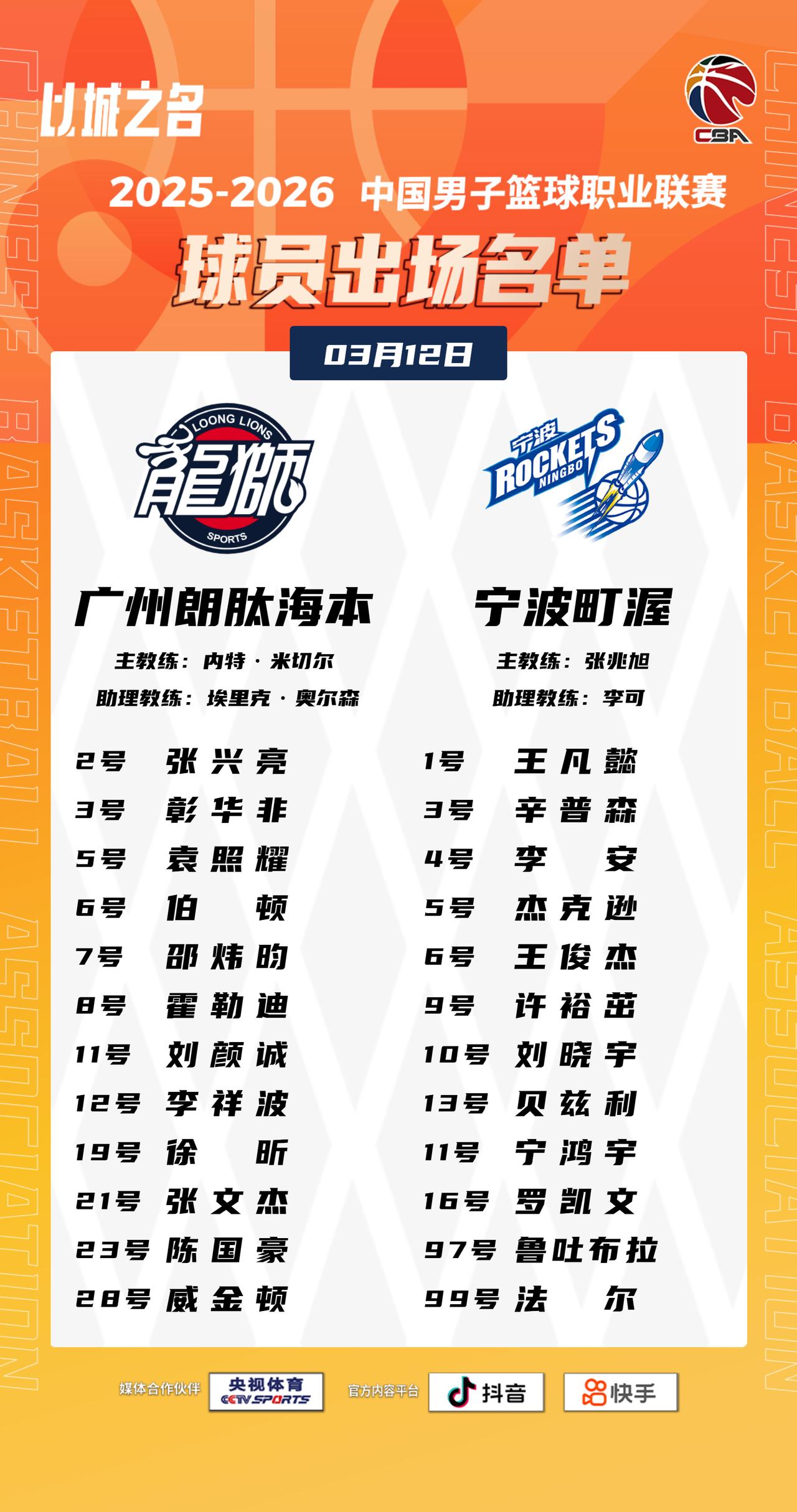 【大名单出炉】2025-2026赛季CBA联赛常规赛第二十四轮今晚继续进行,2场比赛将在19:35同时跳球。敬请期待!以城之名