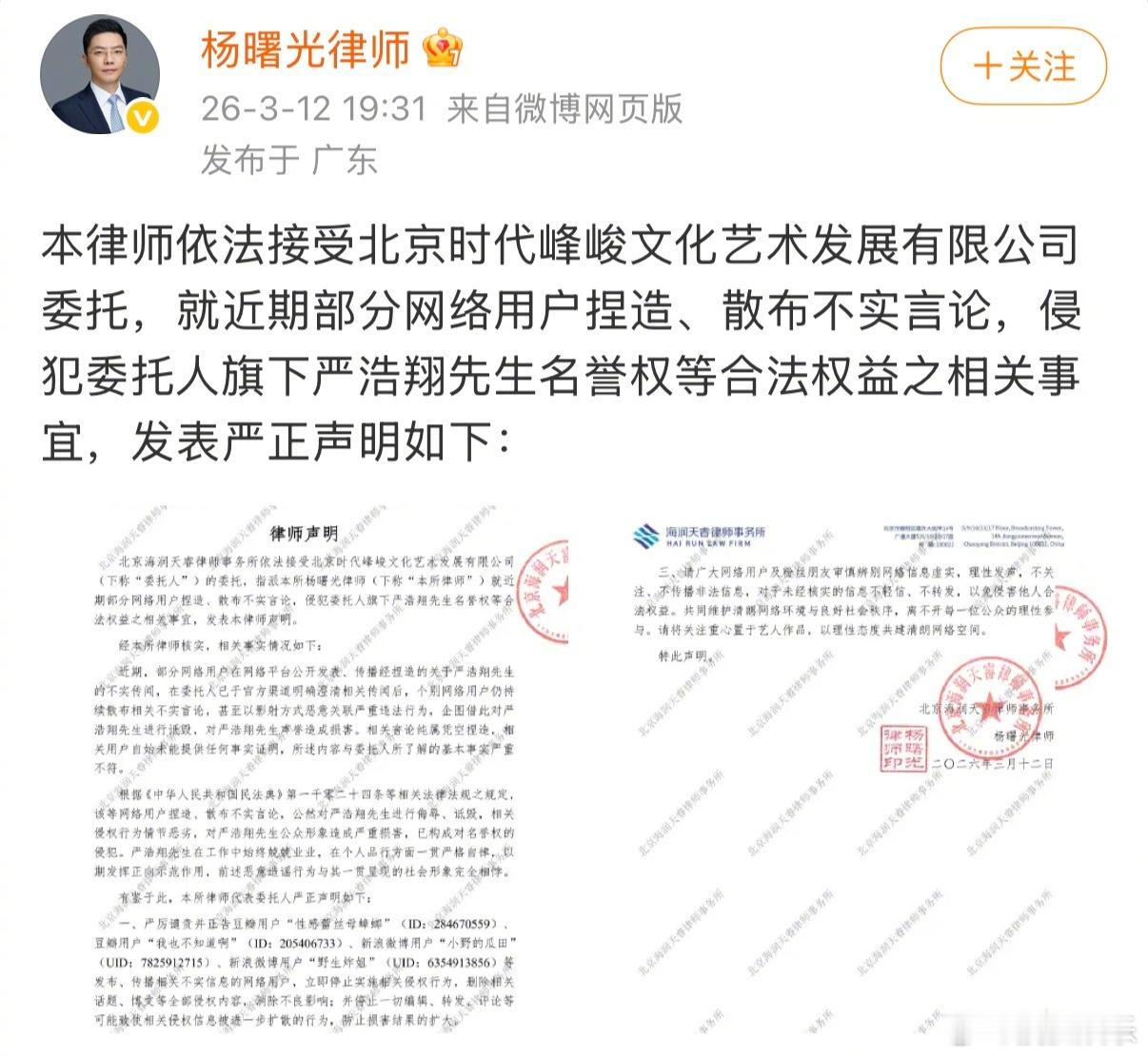 严浩翔律师声明严浩翔律师今日发布声明:“近期,部分网络用户在网络平台公开发表,传