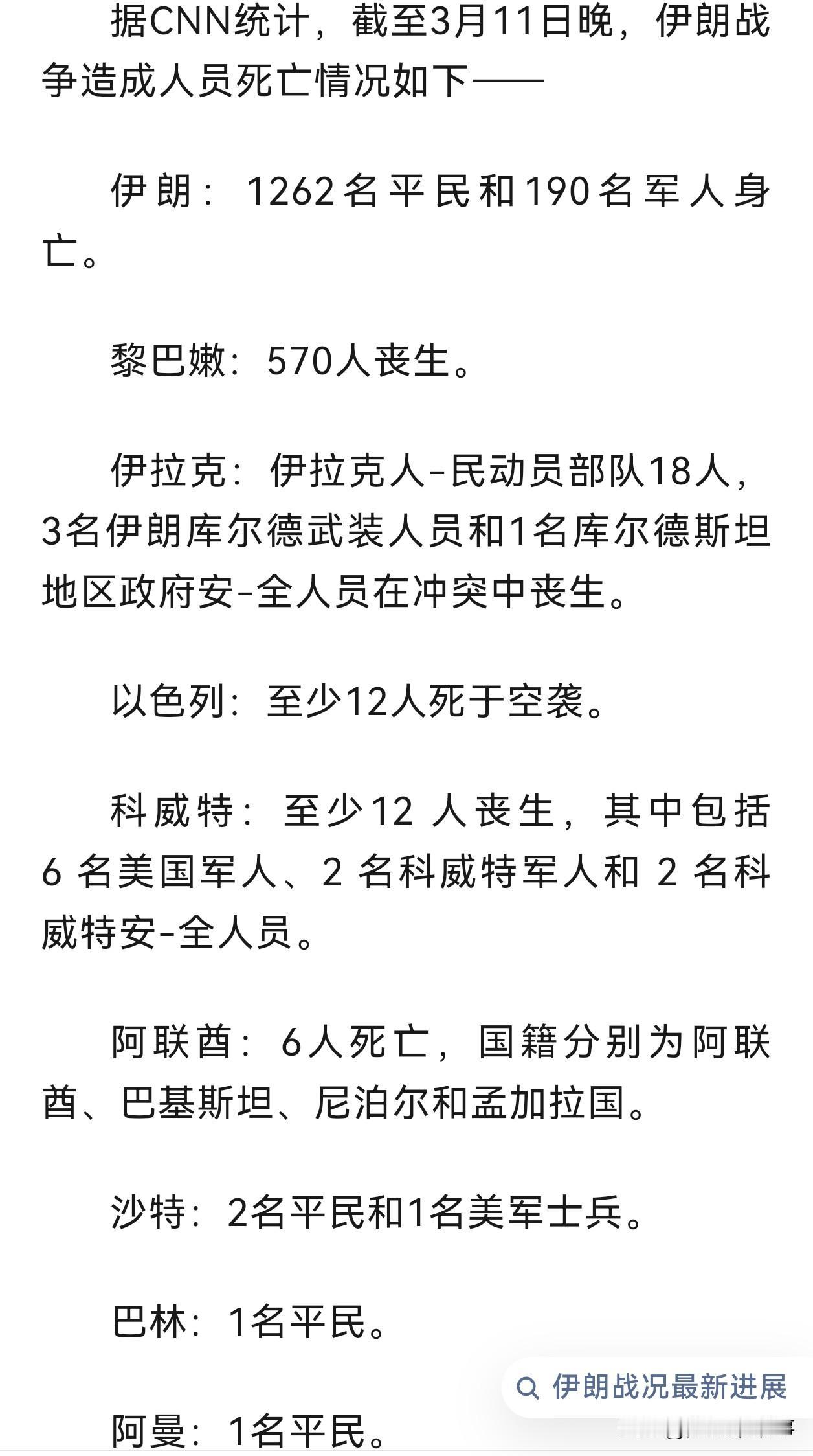 短短11天,一共死了2130人! 据CNN统计,截至3月11日晚,这场席卷中东的冲突已留下冰冷而沉重的生命代价,伊朗最多是1452人,其他有黎巴嫩、伊拉克、科威特、阿联酋、沙特、巴林、阿曼,当然还有以色列的! 想想有多少个家庭支离破损,残缺不全! 这么多人牺牲,如此沉重的代价永远都是由普通人的流血堆积起来的! 这些政治家,其实都是杀人犯!!! 今天又在咖啡厅舒服的工作,想起这几天的中东人,不觉感慨万千…… 带定位晒今日生活 我的今日状态:😁轻松愉快 我这里的天气:☀️晴天
