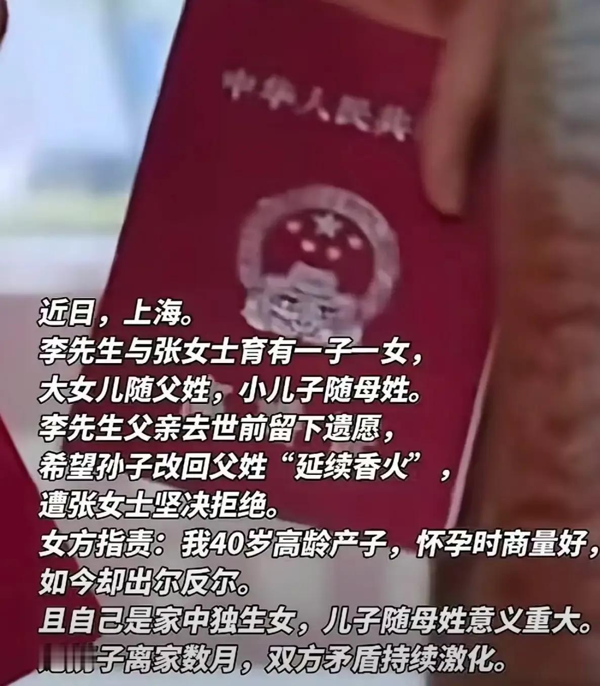 上海一男子遭遇家庭风波,父亲离世前留下遗言,希望孙子能改回父姓以“延续香火”,可妻子却坚决反对,甚至以离婚相逼,这究竟是怎么回事呢? 原来,男子在妻子生下儿子时,曾承诺两个孩子一个随父姓一个随母姓,以此体现夫妻平等。然而,父亲离世前的遗言却打破了这份平衡。男子觉得应该完成父亲的遗愿,于是跟妻子商量,希望将儿子的姓氏改回父姓。但妻子却认为,自己生儿子时差点丢了半条命,男子怎么能出尔反尔呢?她坚决不同意改姓,甚至表示如果男子坚持要改,就离婚。此事一出,网友们也是议论纷纷。有网友提出,那些坚持孩子随母姓的女同志,如果等儿子结婚了,儿媳妇也要孩子随她姓,你们能不能接受呢?这个问题确实引人深思,毕竟姓氏传承在很多人心中都有着重要的意义,但如何在传统与现代之间找到平衡,也是我们需要思考的问题。 姓氏传承虽重要,但家庭和谐更关键。面对这样的家庭矛盾,你会如何选择呢?快来评论区留下你的看法,一起探讨这个话题吧!家庭立遗嘱 儿子立遗嘱 上海遗嘱