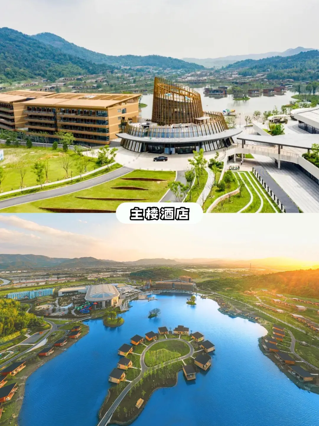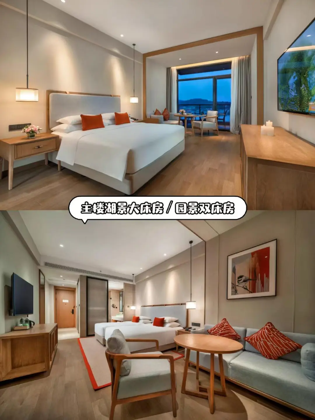 1⃣️主楼酒店:楼下就是幻想岛和水乐园,旁边是餐厅,主打方便。湖景房在房间就可欣赏湖泊山林晚霞,风景不错。