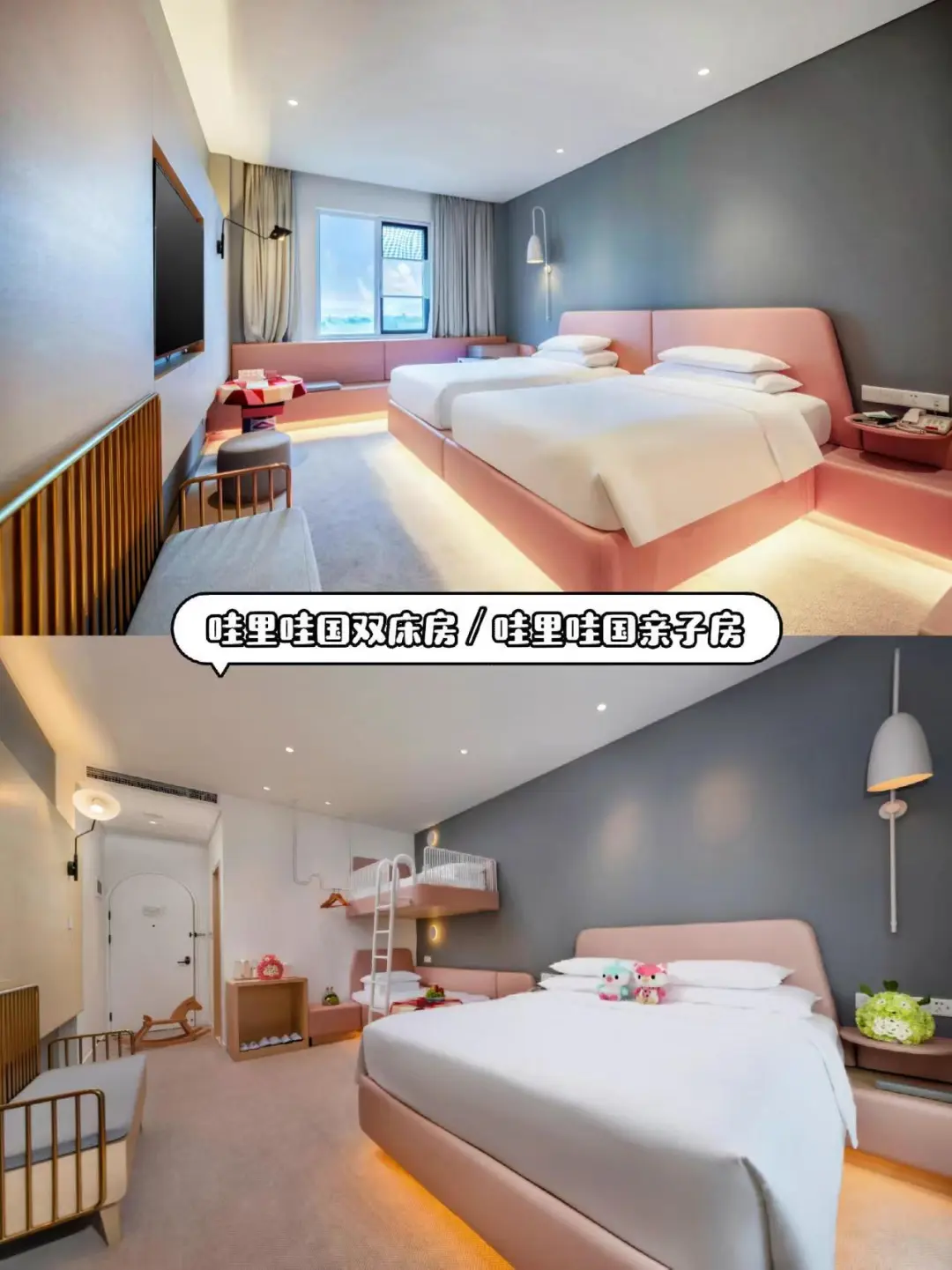 2⃣️哇哩哇国:装修梦幻童趣,设施比较新,是唯一亲子风格酒店,亲子房是上下铺,还外带一个小院子,带娃家庭首选,住了很多小朋友。