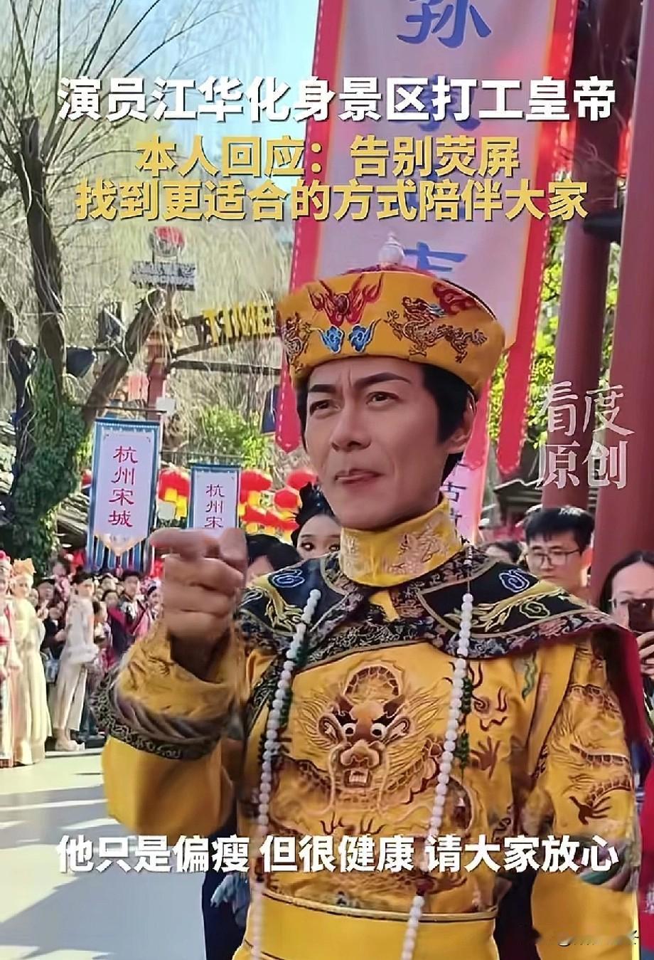 TVB演员江华成景区“打工皇帝”! 娱乐圈也不景气了?荧幕是传奇,台下是生活,曾经颜值与演技双双在线的实力派演员,也到景区打工了,不过话说回来,靠着自己的能力赚钱,都应该被尊重! 3月11日,据大皖新闻报道,TVB老戏骨也开始到景区商演了,他重新穿上戏服龙袍,宛如当年电视剧《九五至尊》里的“雍正皇帝”再现。 他的出现也令景区人气爆棚,江华巡演所到之处都围满了粉丝,与大家近距离互动,握手,拍照根本停不下来。 看得出来江华也非常享受这种不一样的氛围,全程满脸微笑,呐喊声不断,粉丝们也戏称他为“打工皇帝”。 值得一提的是,江华此次回归整个人瘦了好多,当记者询问缘由时,江华说道:“只是瘦了点,但很健康,大家不要担心,平时会适当锻炼,也会好好吃饭”。 当记者询问还会不会回归荧幕时,江华坦言:“目前不太会拍戏了,不是因为不爱演了,因为年纪大了,如今找到了更适合和大家相处的方式。” 真是感慨万千呀!老一辈的TVB演员不但演技好而且敬业,如今为了生活也开始商演了,真是30年河东,30年河西呀! 不过不管什么职业,只要凭本事赚钱,那都是值得点赞的!