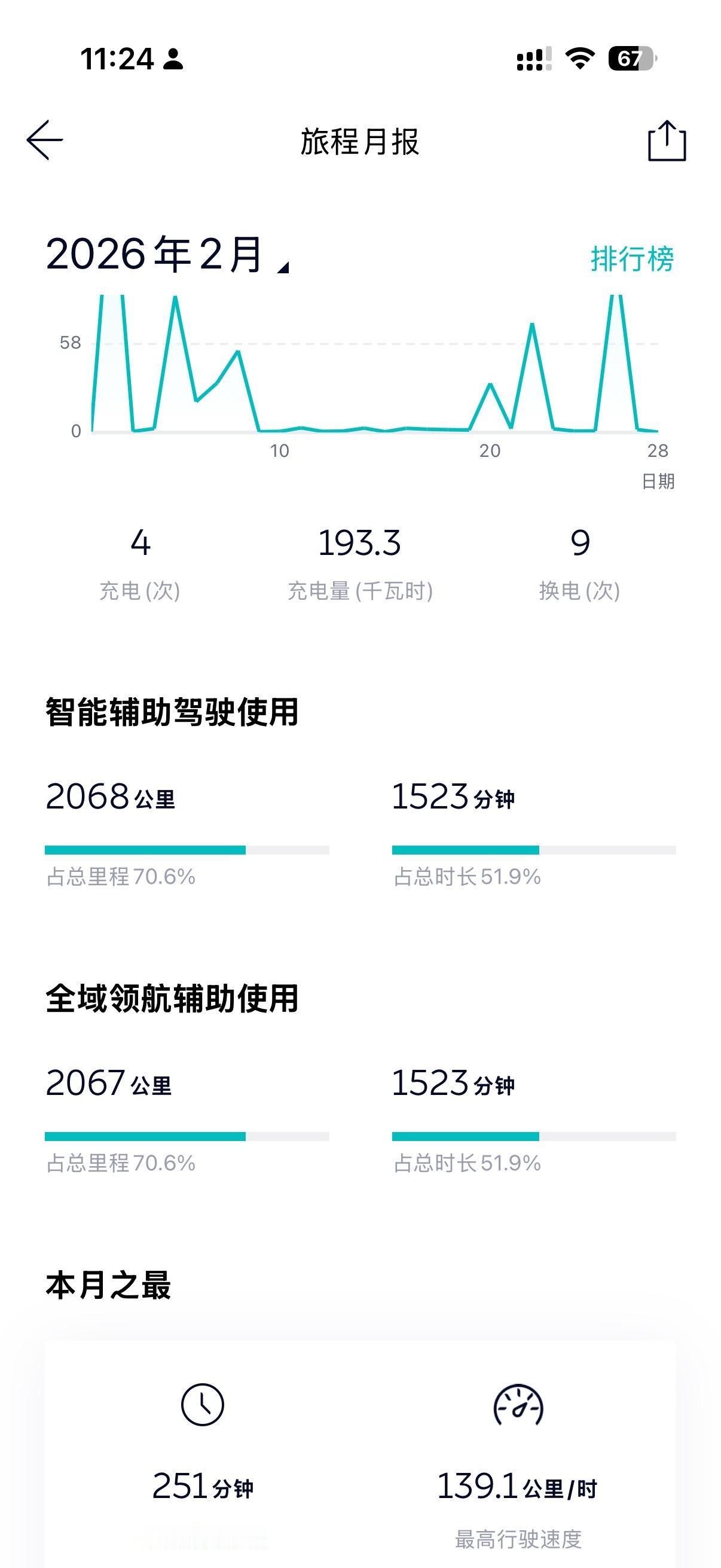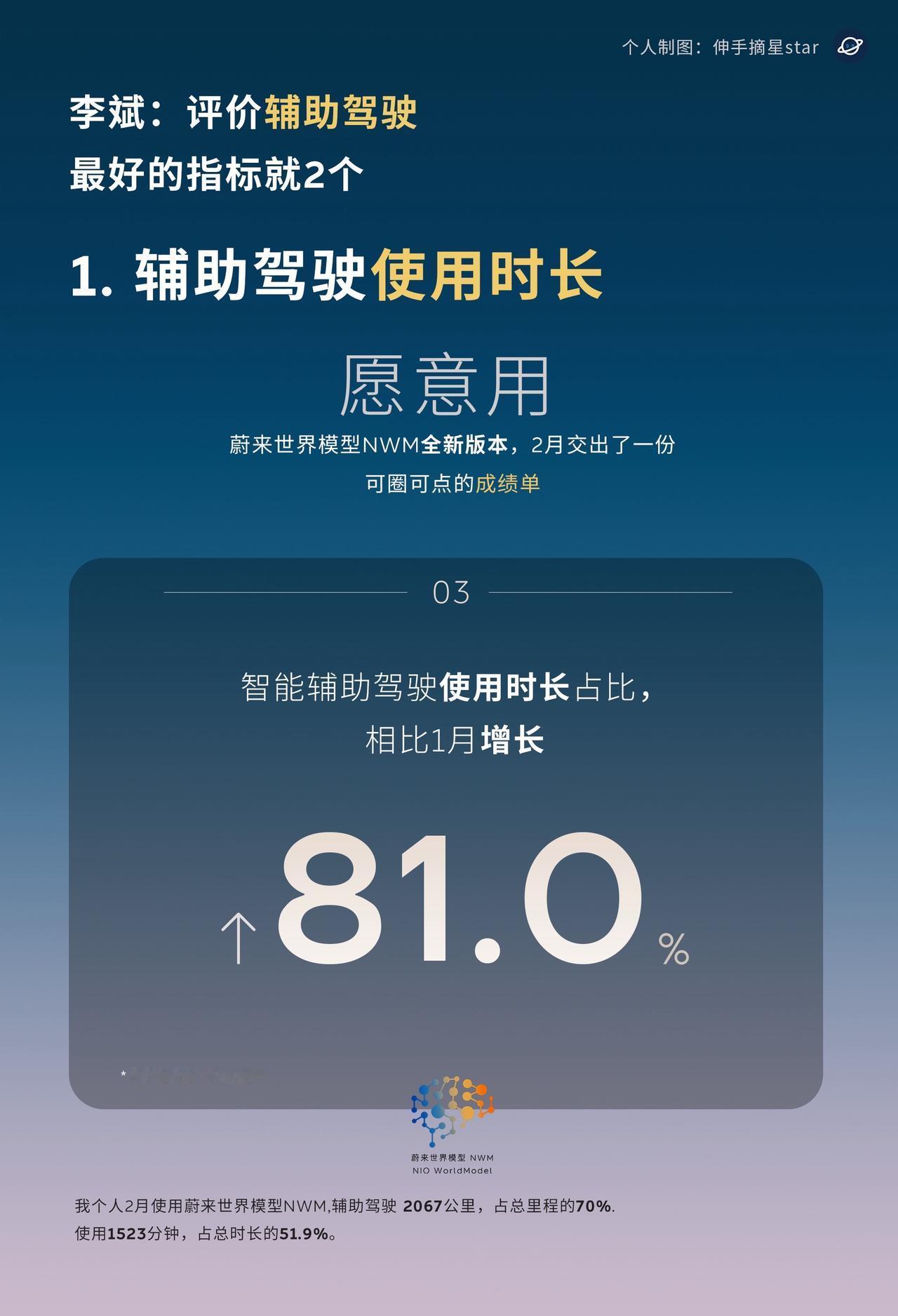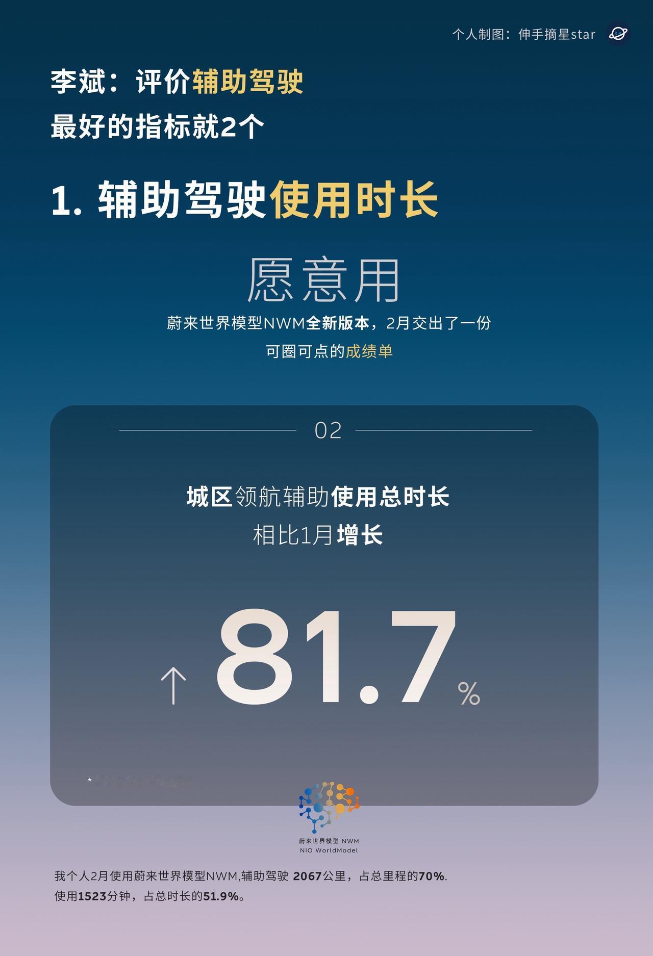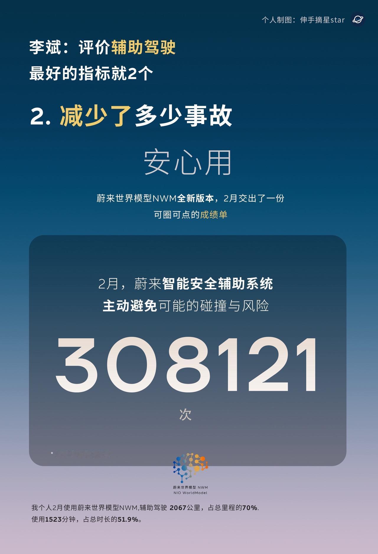最近的媒体沟通会中, 斌哥公布了自己评价辅助驾驶的 最好的指标就2个。 1.辅助驾驶使用时长,用户是否喜欢用,爱用。 2.减少了(避免了)多少事故,用户安心用。 蔚来公布了2月的智驾报告,成绩可圈可点。 世界模型NWM 最新的版本, 车友们的确是爱用,喜欢用。 我自己2月智驾开了2000多公里, 里程占总里程的70%, 里程短的我不想导航, 就没有用NOP+,不然里程数据更高。 智驾里程与时长都超了50%。 今年世界模型还有2个版本的更新, 相信会越来月好用的。 安全,一直是蔚来的优先项, 也是行业里AEB/AES 做的好的车企之一。 蔚来在新技术, 首先赋能的就是安全。 辅助驾驶 蔚来 蔚来智驾 蔚来世界模型