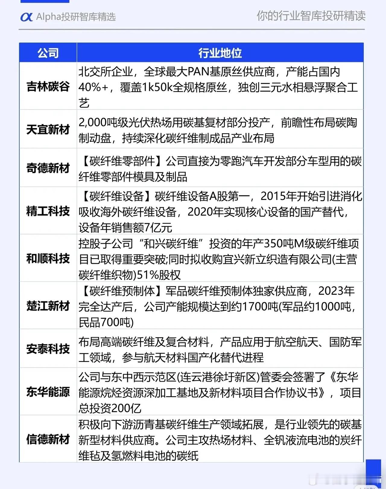 1. 技术突破:3月11日我国自主研发的T1200级超高强度碳纤维全球首发,由中国建材集团研发,已具备百吨级量产能力,使我国成为全球首个实现该级别碳纤维百吨级量产的国家,填补全球空白。2. A股核心企业(产能/销量/地位): - 碳纤维产能:吉林化纤(A股第一,年产25000吨,国内占比28%)、中复神鹰(第二,11000吨,12%)、上海石化(第三,7500吨,9%)、光威复材(第四,3100吨,4%)、中简科技(第五,250吨,在建1000吨)。 - 碳基复合材料销量:金博股份(A股第一,年销2480吨)、中天火箭(第二,832吨)。 - 其他定位:中航高科(为中国商飞供T800复材,验证阶段);吉林碳谷(北交所,全球最大PAN基原丝供应商,国内占比40%+,全规格覆盖);天宜新材(2000吨光伏热场碳基复材投产,布局碳陶制动盘);奇德新材(为零跑汽车供碳纤维零部件模具/制品);精工科技(碳纤维设备A股第一,2020年国产替代,年销7亿);和顺科技(和兴碳纤维年产350吨M级项目突破,拟收购碳纤维织物公司51%股权);楚江新材(军品预制体独家供应,2023年达产1700吨);安泰科技(高端碳纤维及复材,涉航空航天、国防军工);东华能源(投200亿建烷烃深加工基地);信德新材(沥青基碳纤维拓展,热场材料、电池炭纤维毡/碳纸领先)。