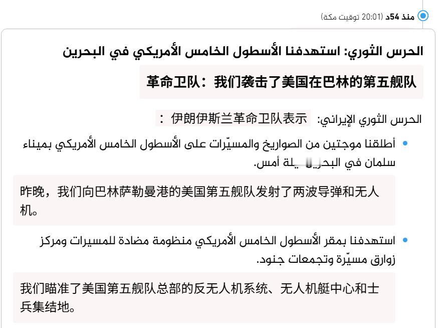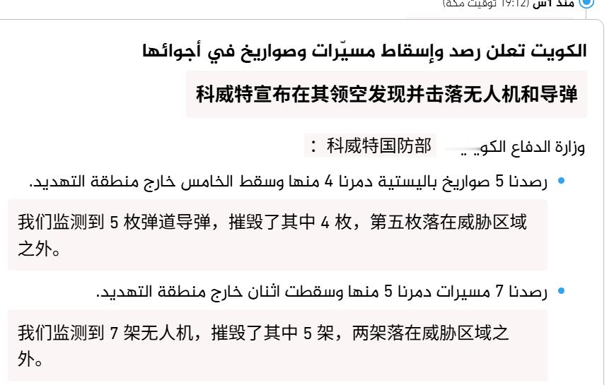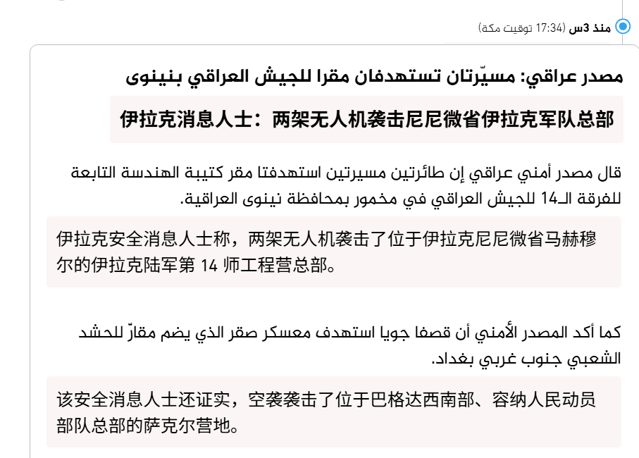 🔻伊朗革命卫队:我们袭击了美国在巴林的第五舰队基地。🔻沙特国防部表示:我们在鲁卜哈利沙漠拦截并摧毁了一架正飞往谢拜油田的无人机。🔻科威特国防部:我们监测到 5 枚弹道导弹,摧毁了其中 4 枚,第五枚落在威胁区域之外。我们监测到 7 架无人机,摧毁了其中 5 架,2 架落在威胁区域之外。🔻伊拉克消息人士:两架无人机袭击了位于伊拉克尼尼微省马赫穆尔的伊拉克陆军第 14 师工程营总部。该安全消息人士还证实,空袭袭击了位于巴格达西南部、容纳人民动员部队总部的萨克尔营地。🔻以上四条消息甚至不仅仅是一方发起的攻击。🔻via ajlanews 伊朗最高领袖公开声明美国防部被曝龙虾门海外新鲜事中东现场直击